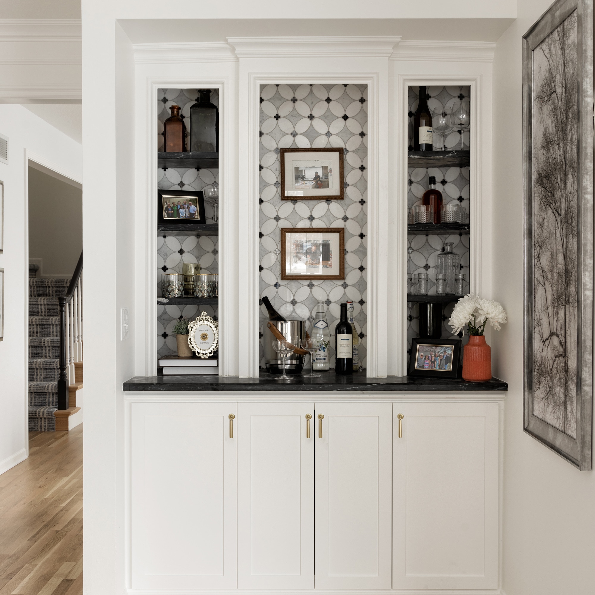 Lavaliere in Carrara Thassos Black Antique Mirror Petal mosaic accentuates the dry bar, adding a touch of sophisticated character to the overall design. Showcased in a unique installation, our Natural Stone Slab in Soapstone on the countertop and as the dry bar shelves.