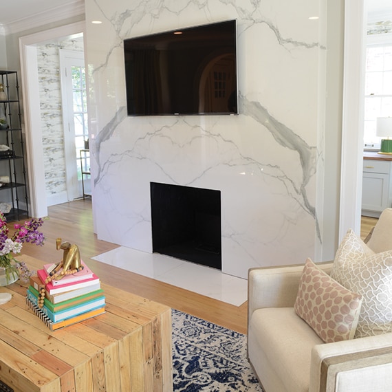 Fireplace surround features Panoramic Porcelain Surfaces® Elemental Selection glossy slab in Statuario.