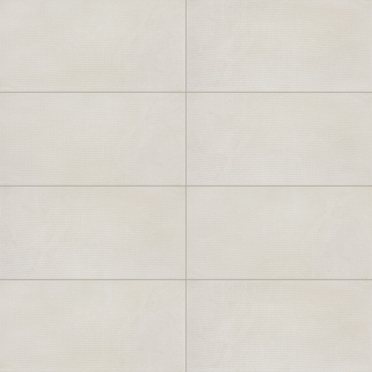 White concrete-look porcelain tile in Chalk. A 12x24 textured tile with woven detail for dimensional wall and floor design.
