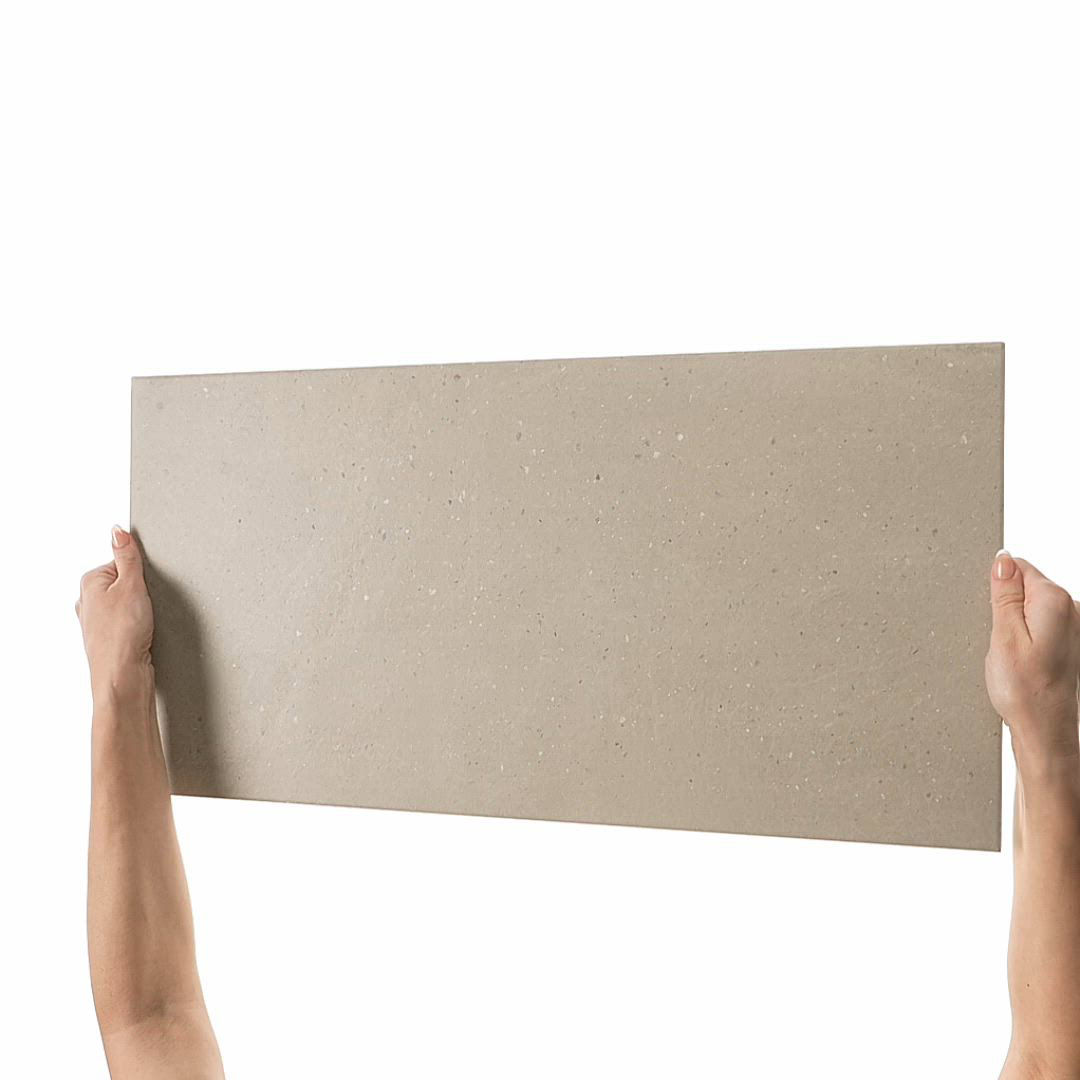 This beige concrete-look porcelain tile pairs fine pebbling with matte durability for floors, walls, and backsplashes.