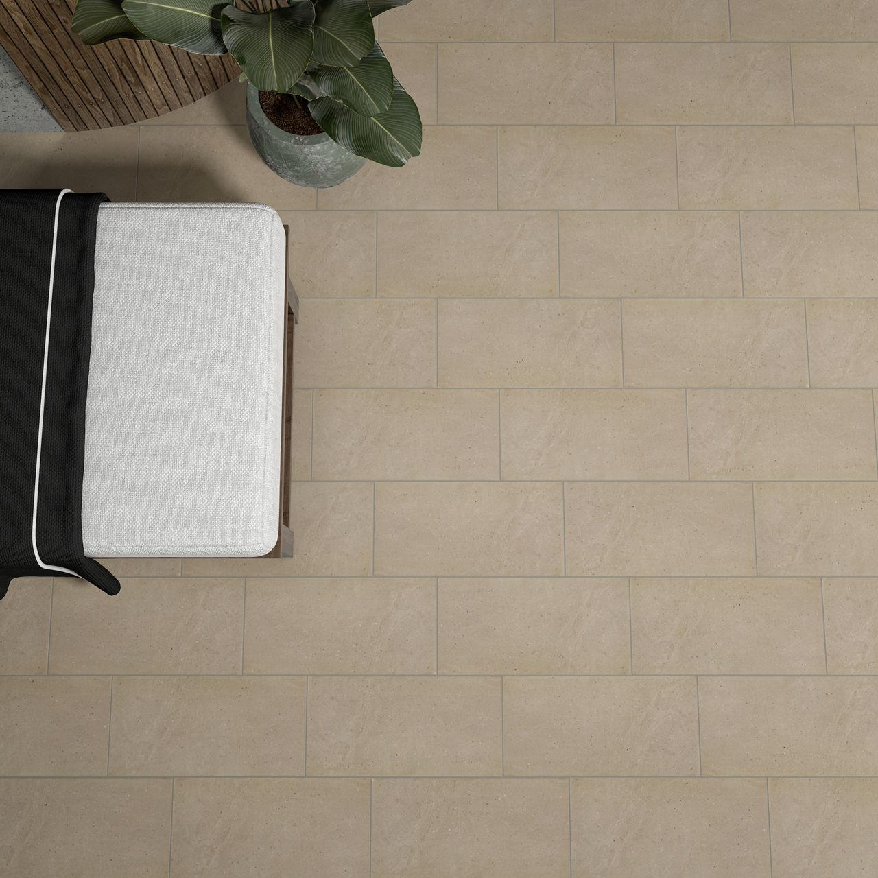 Beige concrete-look porcelain tile in Gesso. A 12x24 matte tile with fine pebbling for modern, minimalist spaces.