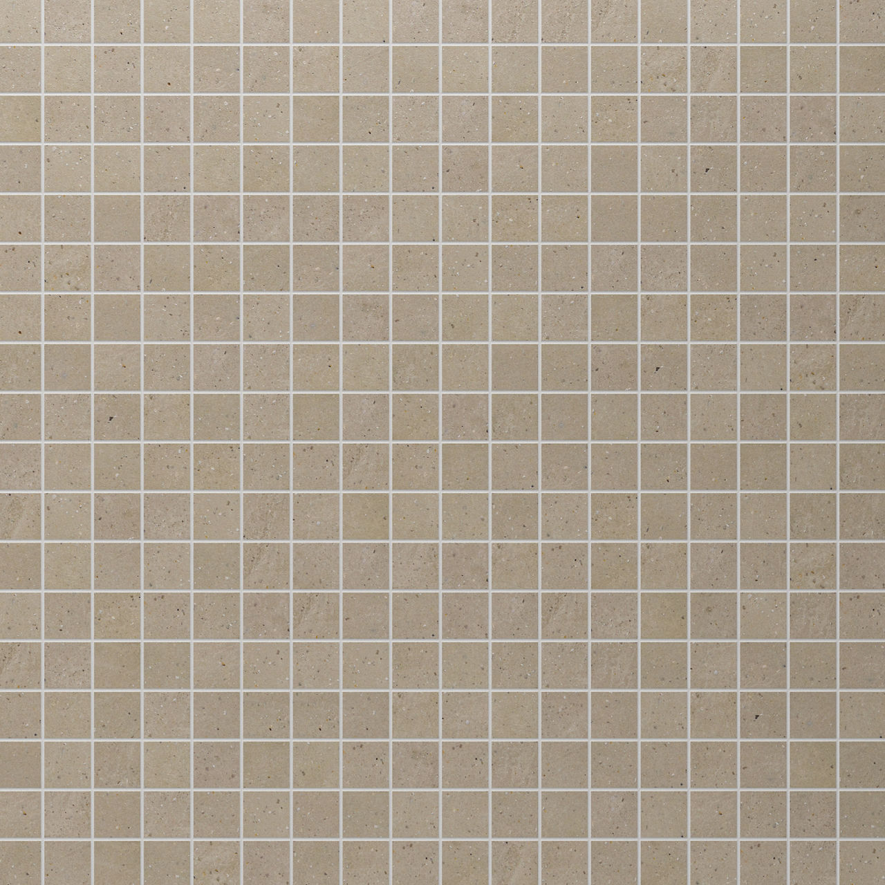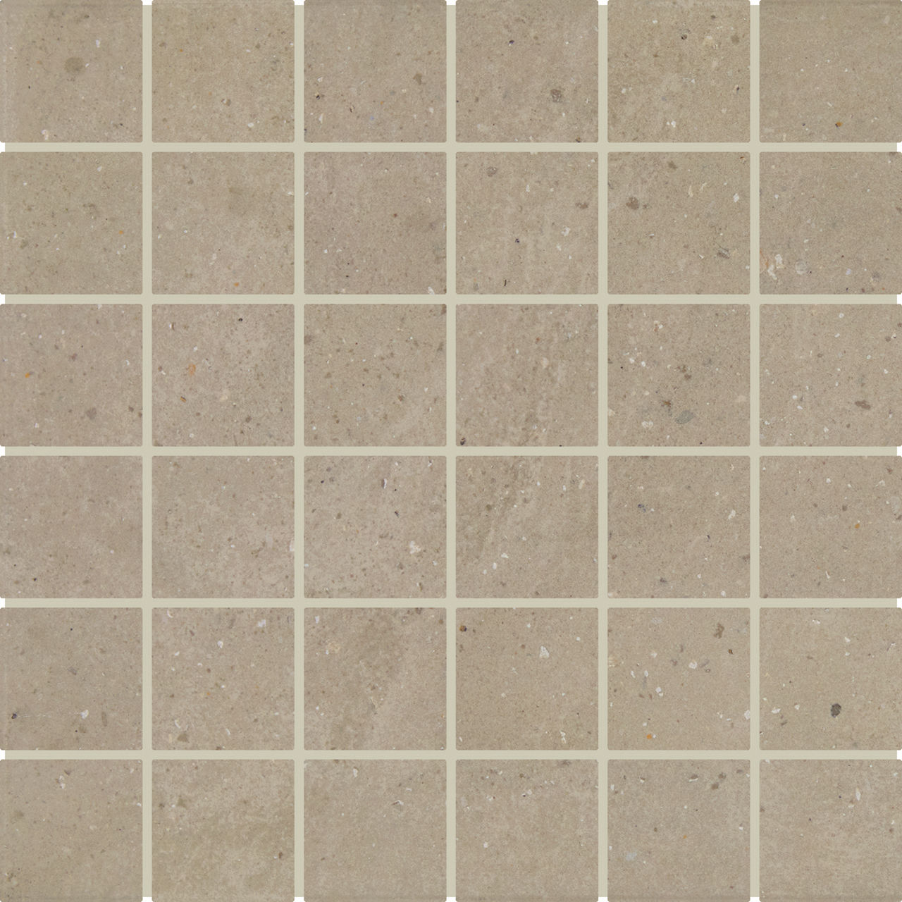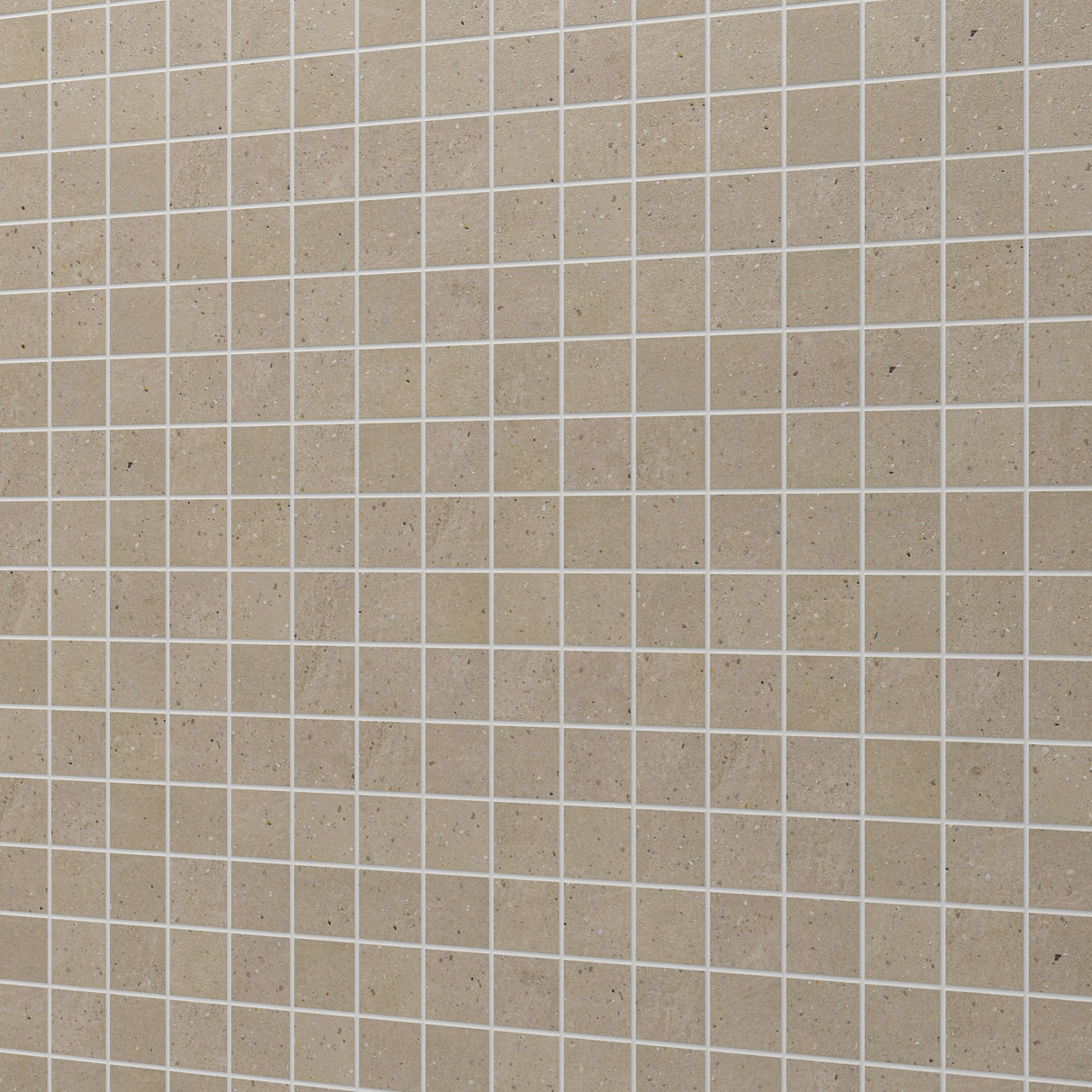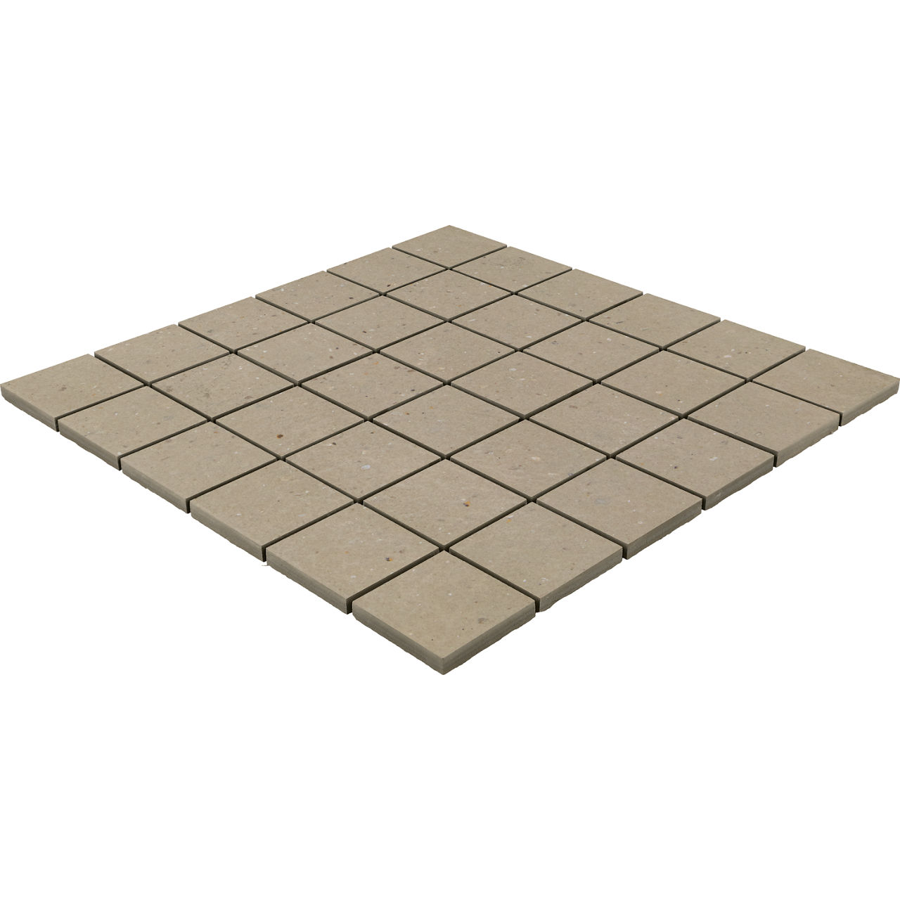 Beige concrete-look porcelain mosaic tile in Gesso. A 2x2 matte mosaic with straight joint layout for showers and backsplashes.