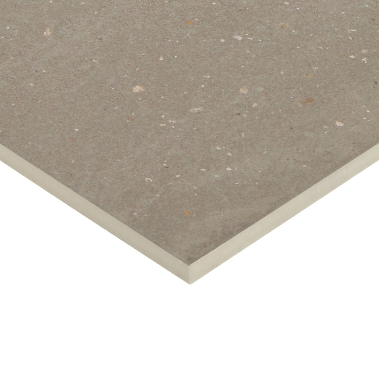 This taupe concrete-look porcelain tile pairs fine pebbling with matte durability for floors, walls, and backsplashes.