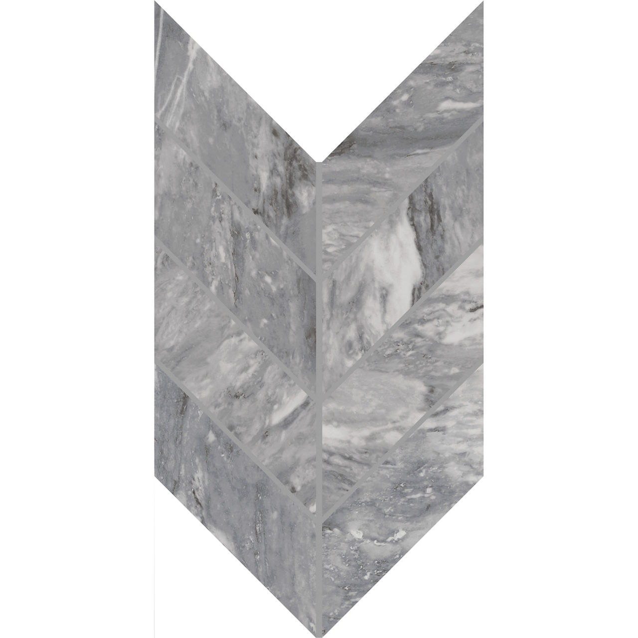 Lavish marble look tile offers dramatic gray or white marble style in durable porcelain. Available in chevron and several decorative mosaics.