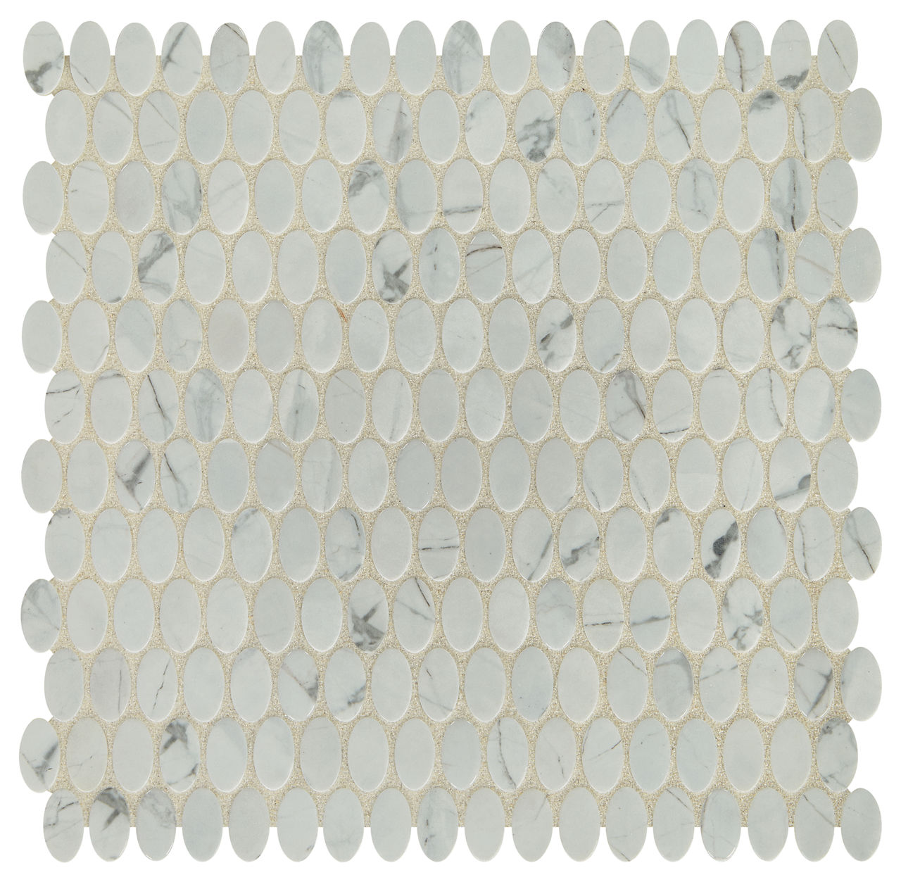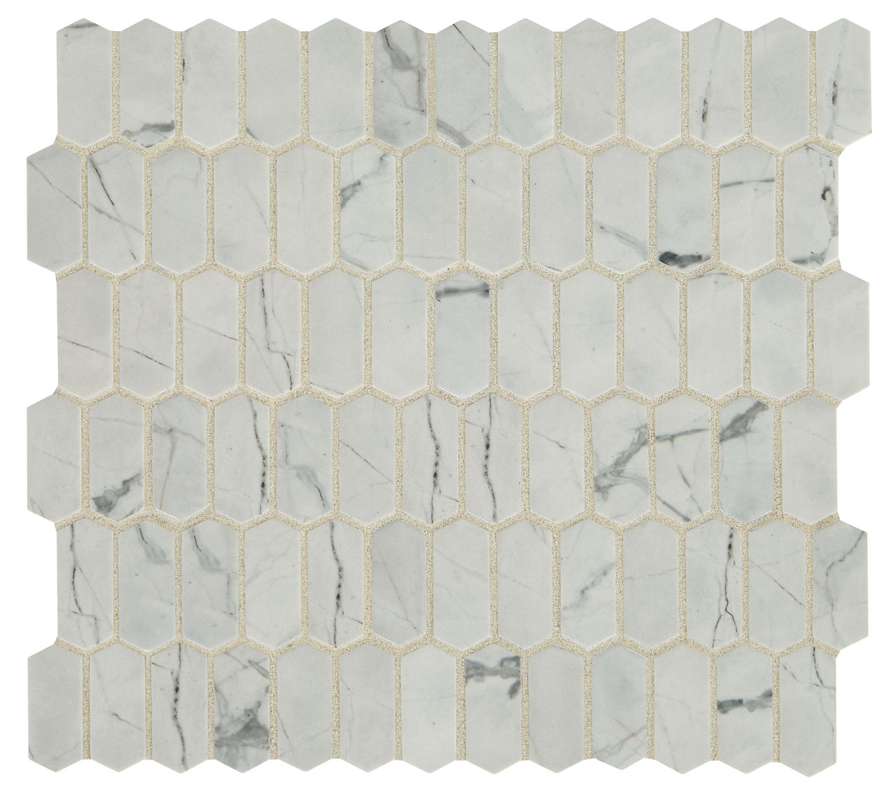 Innovative glass mosaic tile that looks like marble brings elegant style to your backsplash. Available in small ovals or picket shapes.