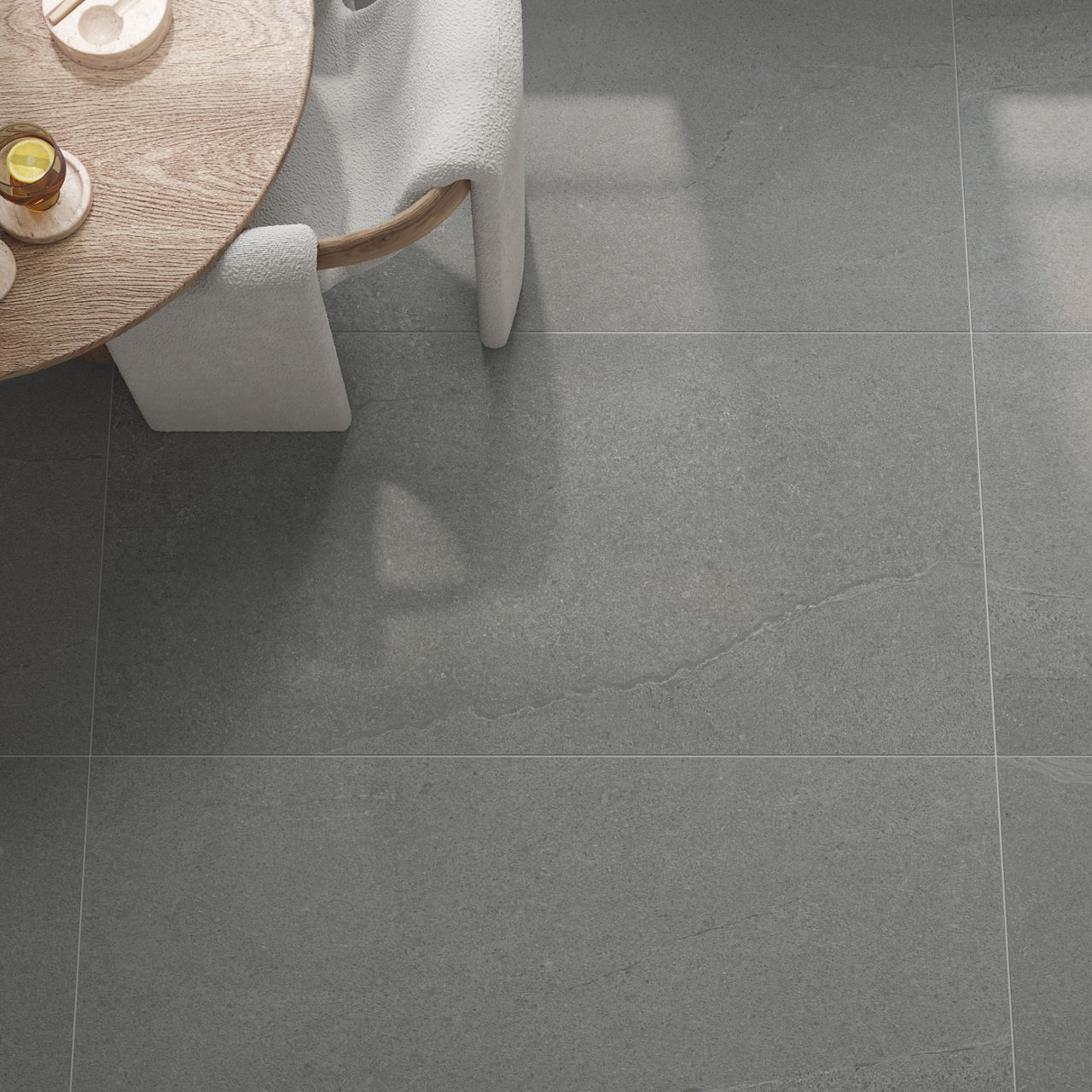 This gray stone-look tile offers a clean, natural aesthetic with durable performance for versatile spaces.