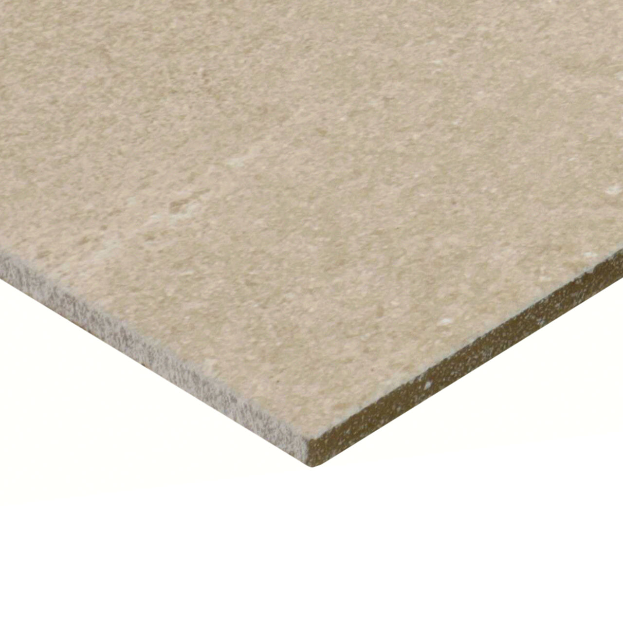 This beige stone-look tile offers a clean, natural aesthetic with durable performance for versatile spaces.