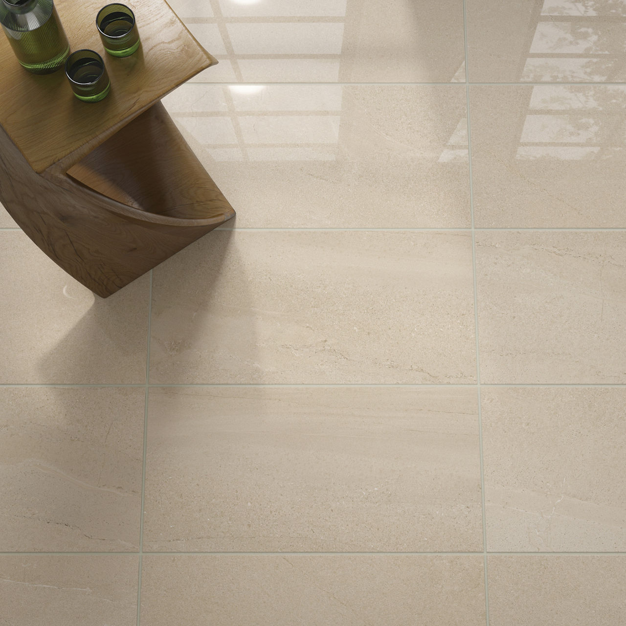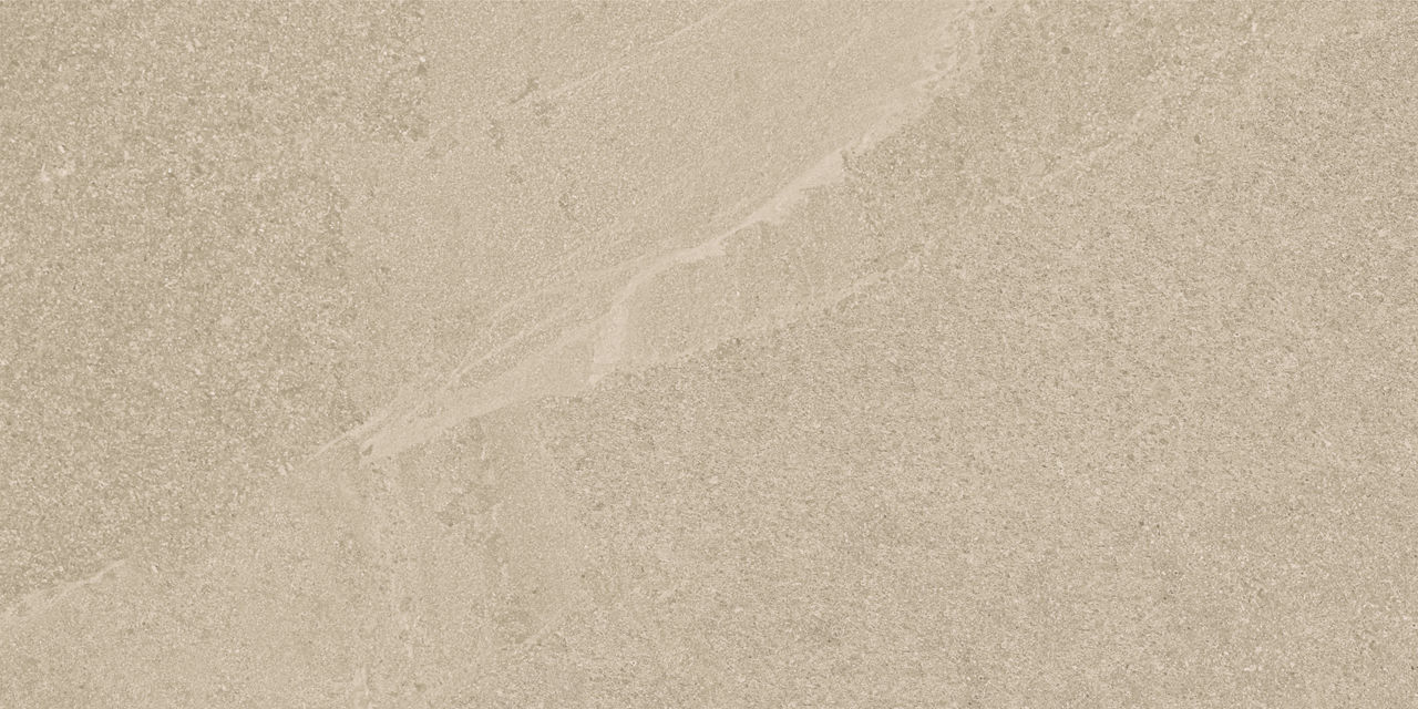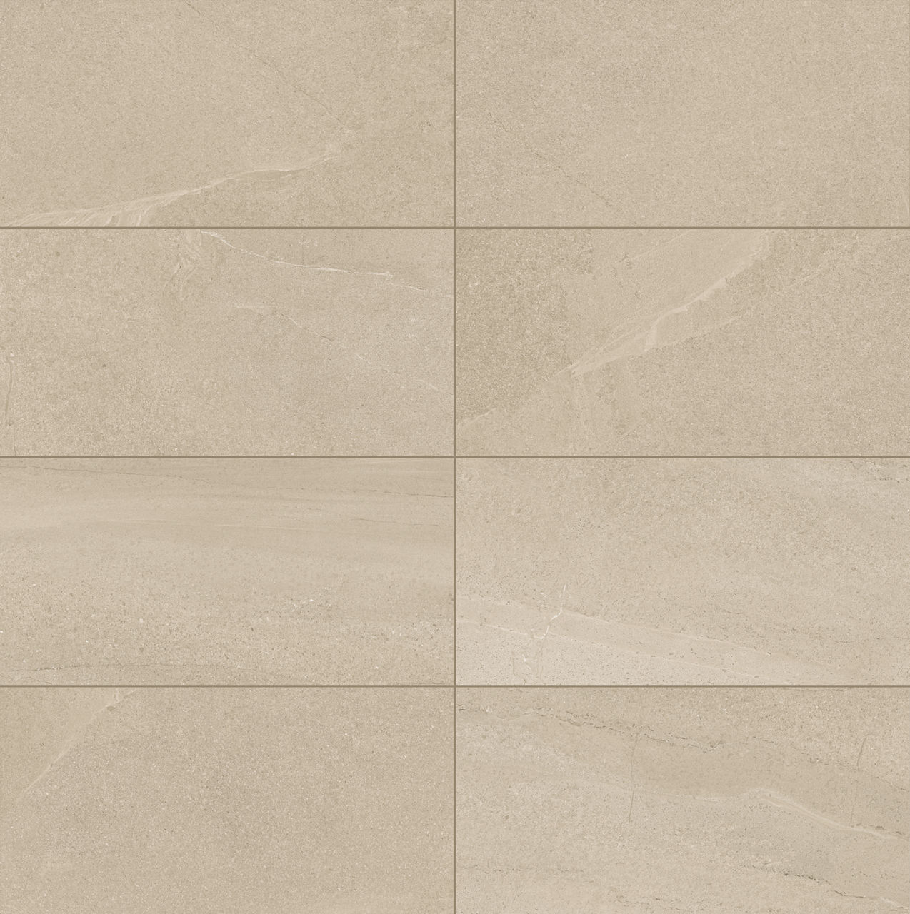 Beige stone-look porcelain tile in Fawn. A 12X24 polished tile for modern design applications.
