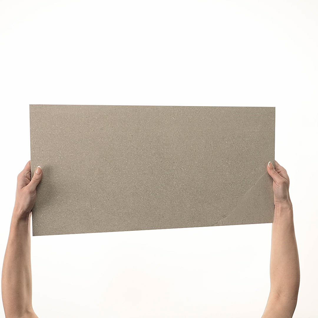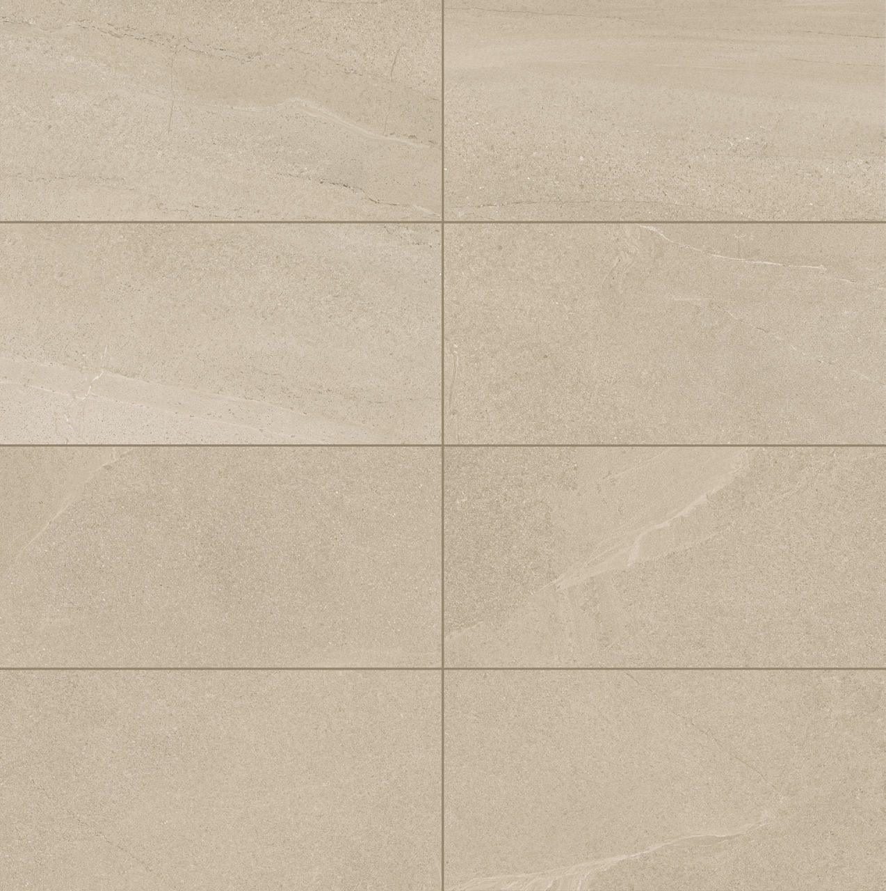 Beige stone-look porcelain tile in Fawn. A 12X24 matte tile for modern design applications.