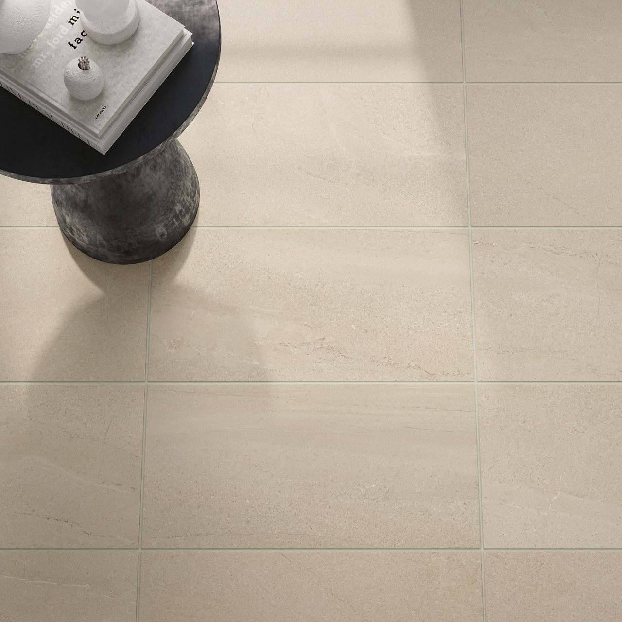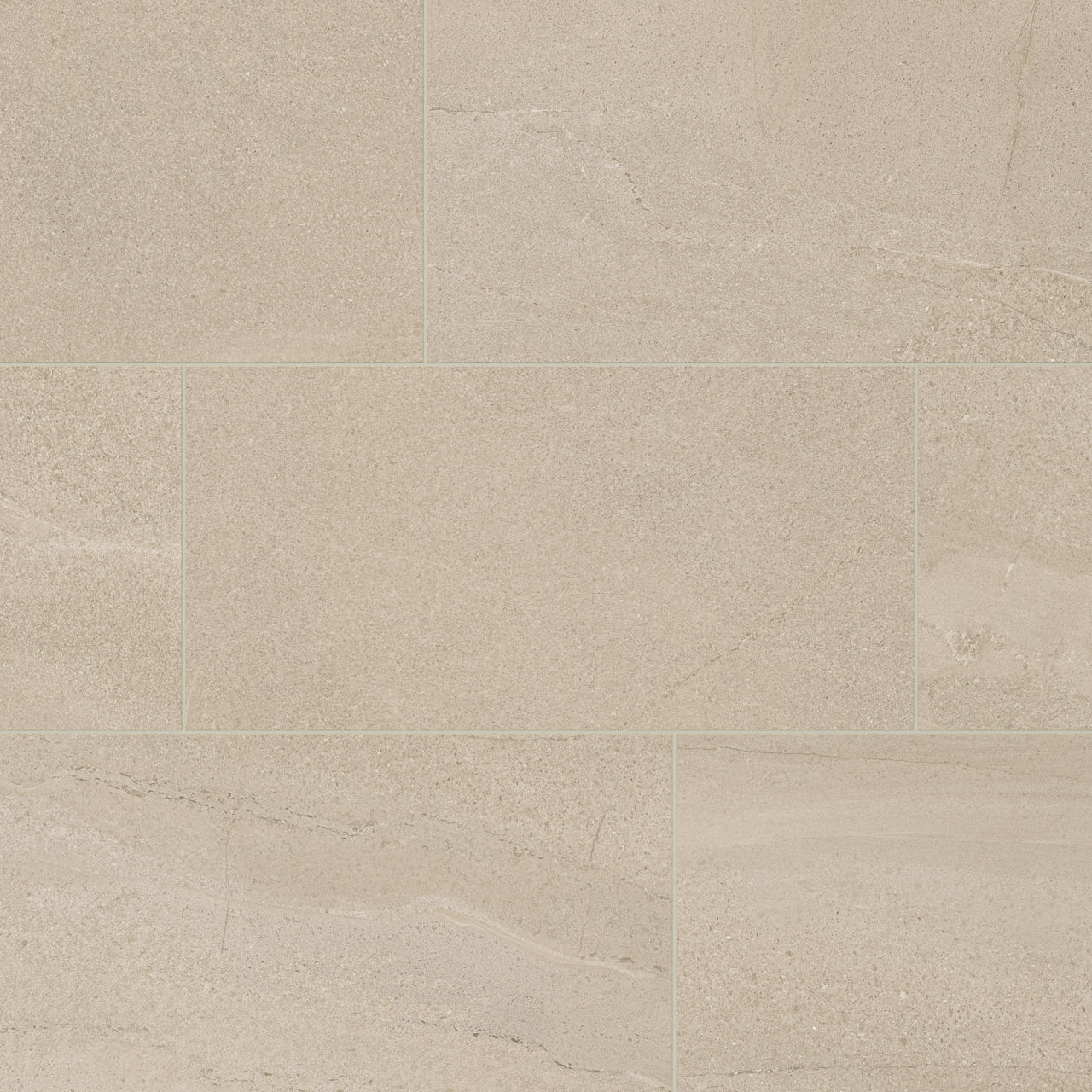 This beige stone-look tile offers a clean, natural aesthetic with durable performance for versatile spaces.