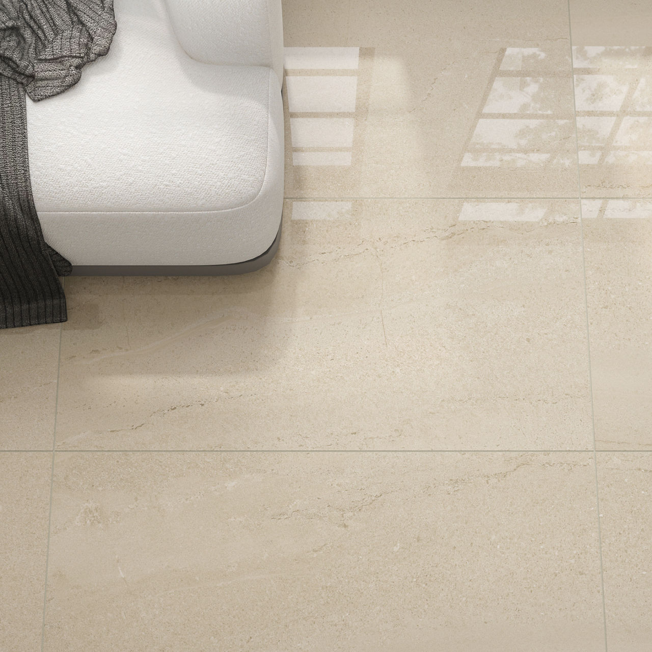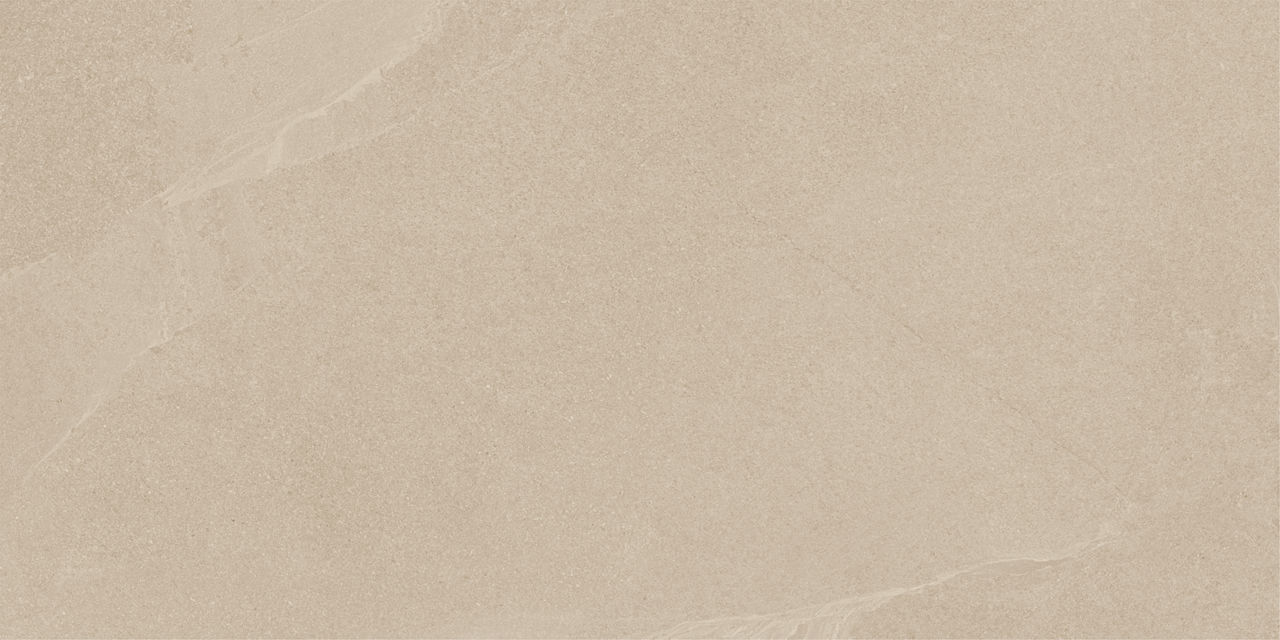 Beige stone-look porcelain tile in Fawn. A 24X48 polished tile for modern design applications.