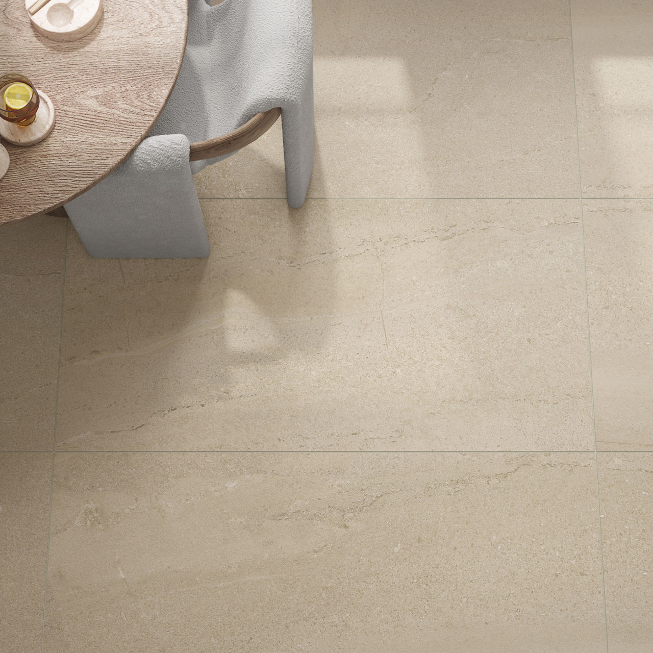 This beige stone-look tile offers a clean, natural aesthetic with durable performance for versatile spaces.