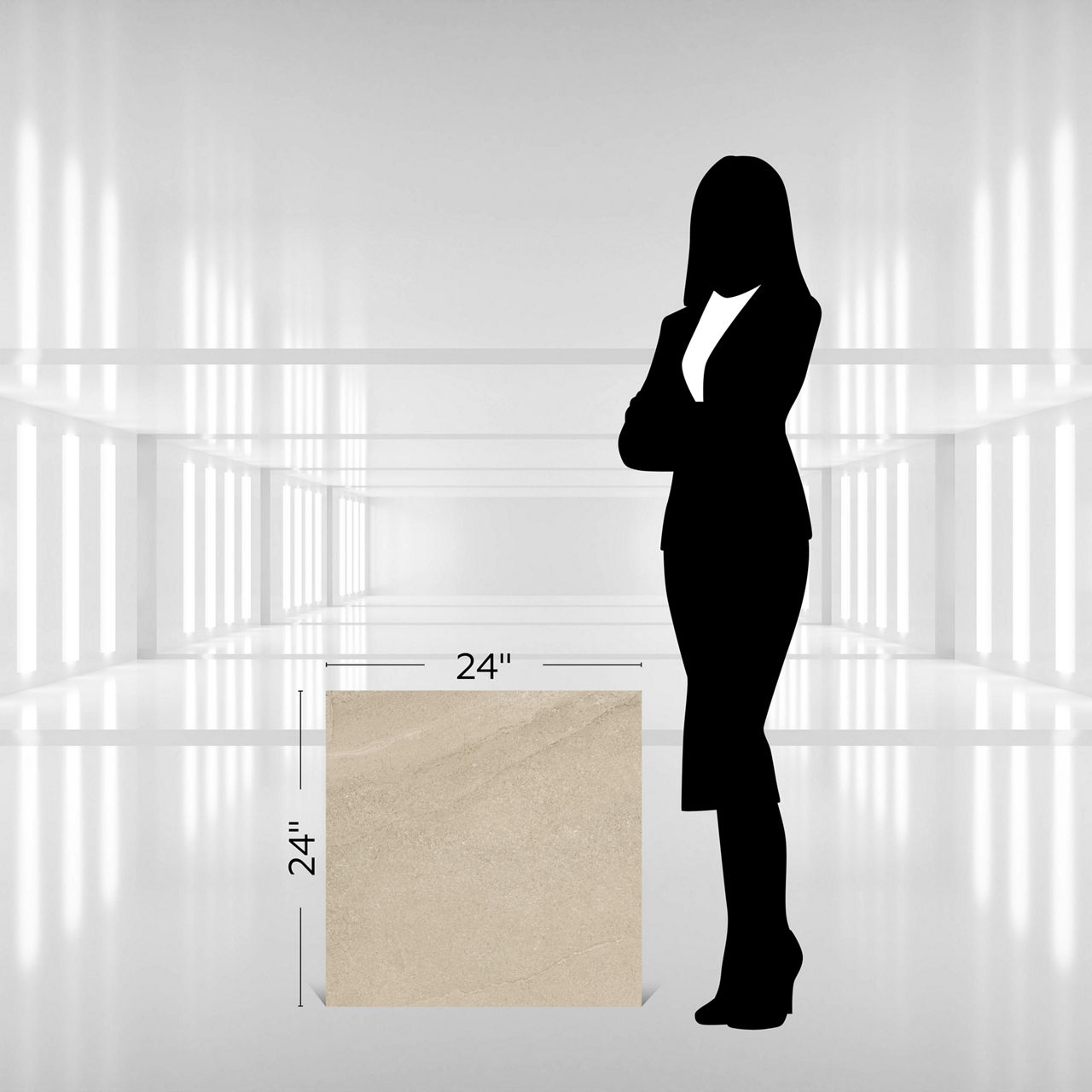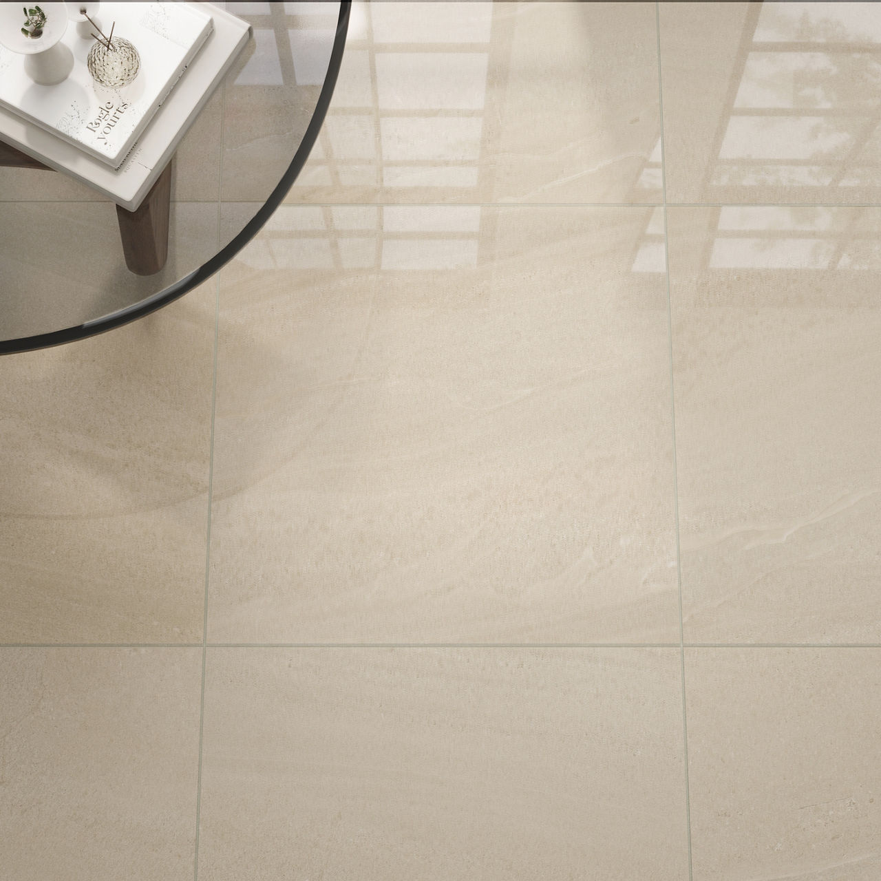 Beige stone-look porcelain tile in Fawn. A 24X24 polished tile for modern design applications.