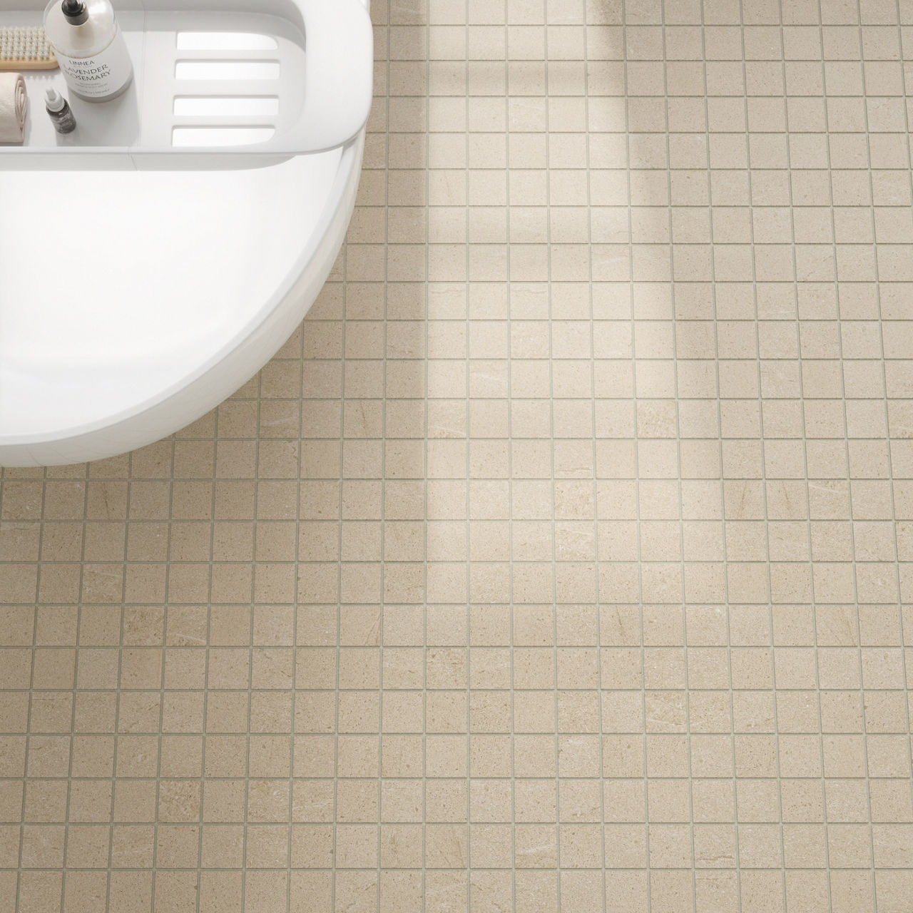 Beige stone-look porcelain tile in Fawn. A 2X2 matte tile for modern design applications.