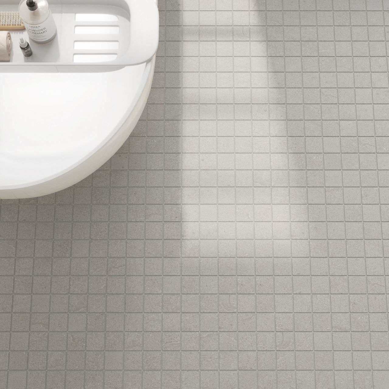 Calgary Fog 2X2 stone-look porcelain tile features a refined natural aesthetic in durable ColorBody construction. Designed in a 2X2 format, it delivers mosaic format for detailed surfaces. Its StepWise slip-resistant matte enhances performance and visual depth, making it ideal for floor and wall applications.