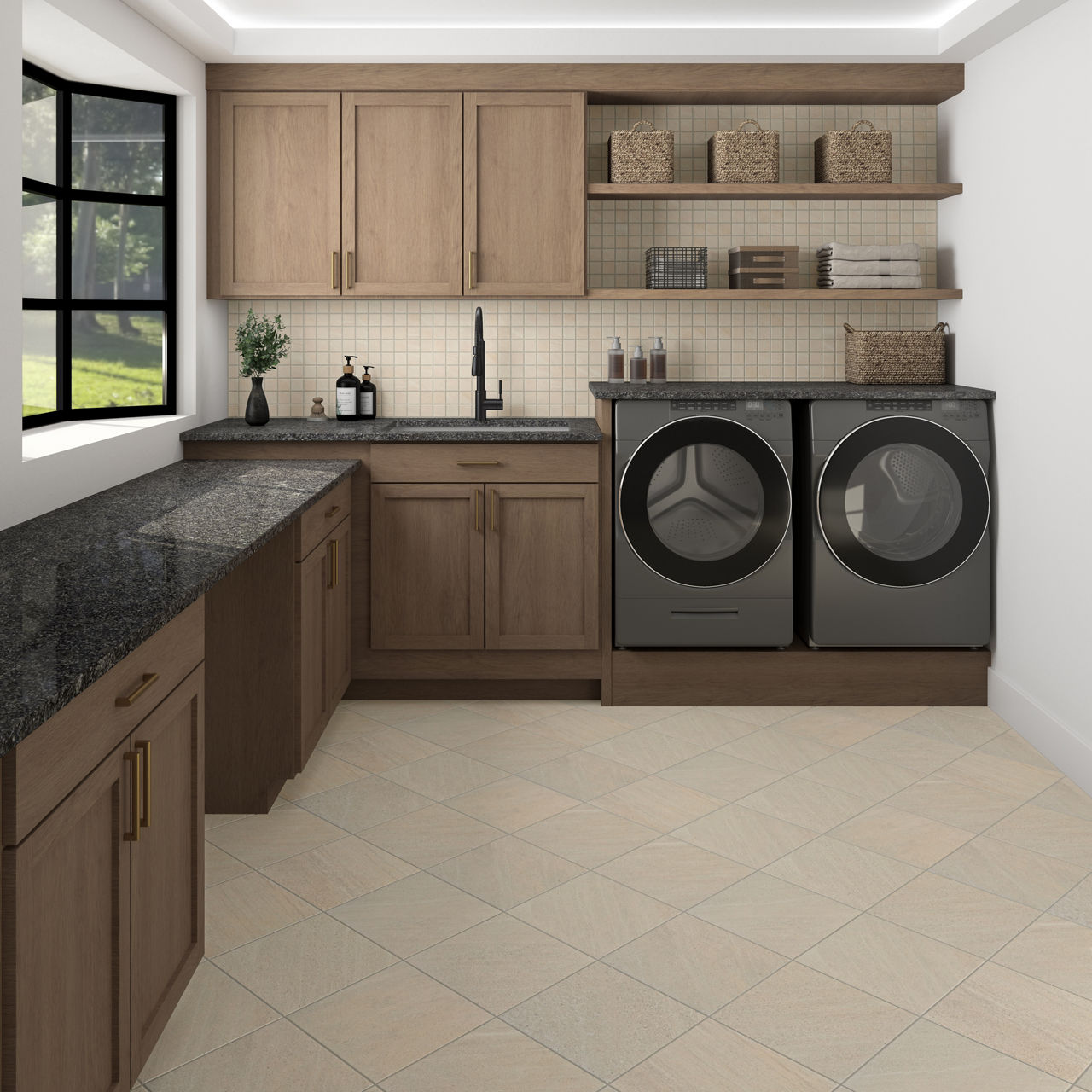 Beige stone-look ceramic tile in Calm Beige. A 2X2 matte tile designed for balanced, modern spaces.