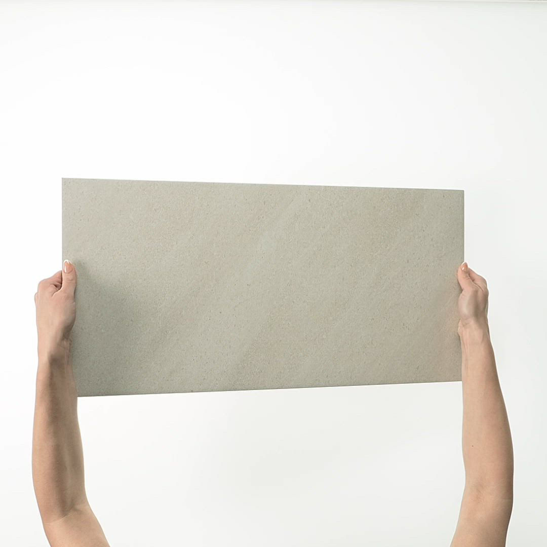 White stone-look ceramic tile in Everest White. A 12X24 matte tile designed for balanced, modern spaces.