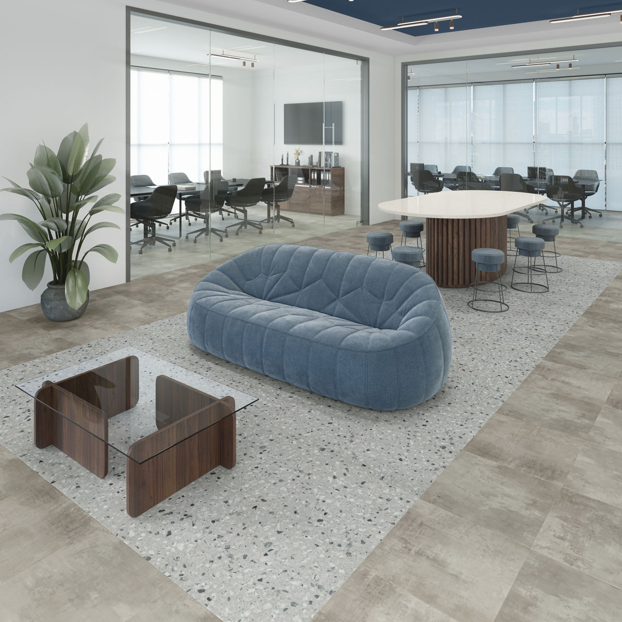 Multimedia Delta 18X18 TitanGuard luxury vinyl tile features a terrazzo look design with embossed texture. Designed in a 18X18 format, it offers durability and modern style. Its TitanGuard finish enhances performance, making it ideal for commercial floors. A perfect choice for contemporary interiors. The fleck distribution is uniquely balanced to create visual movement across the surface.