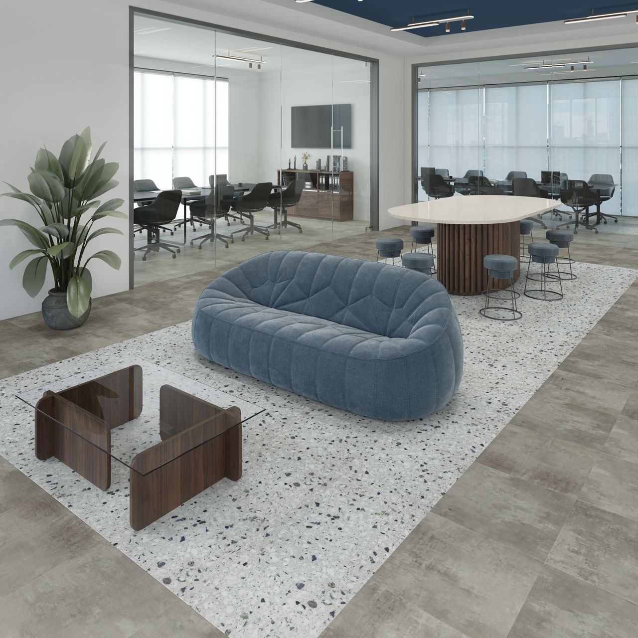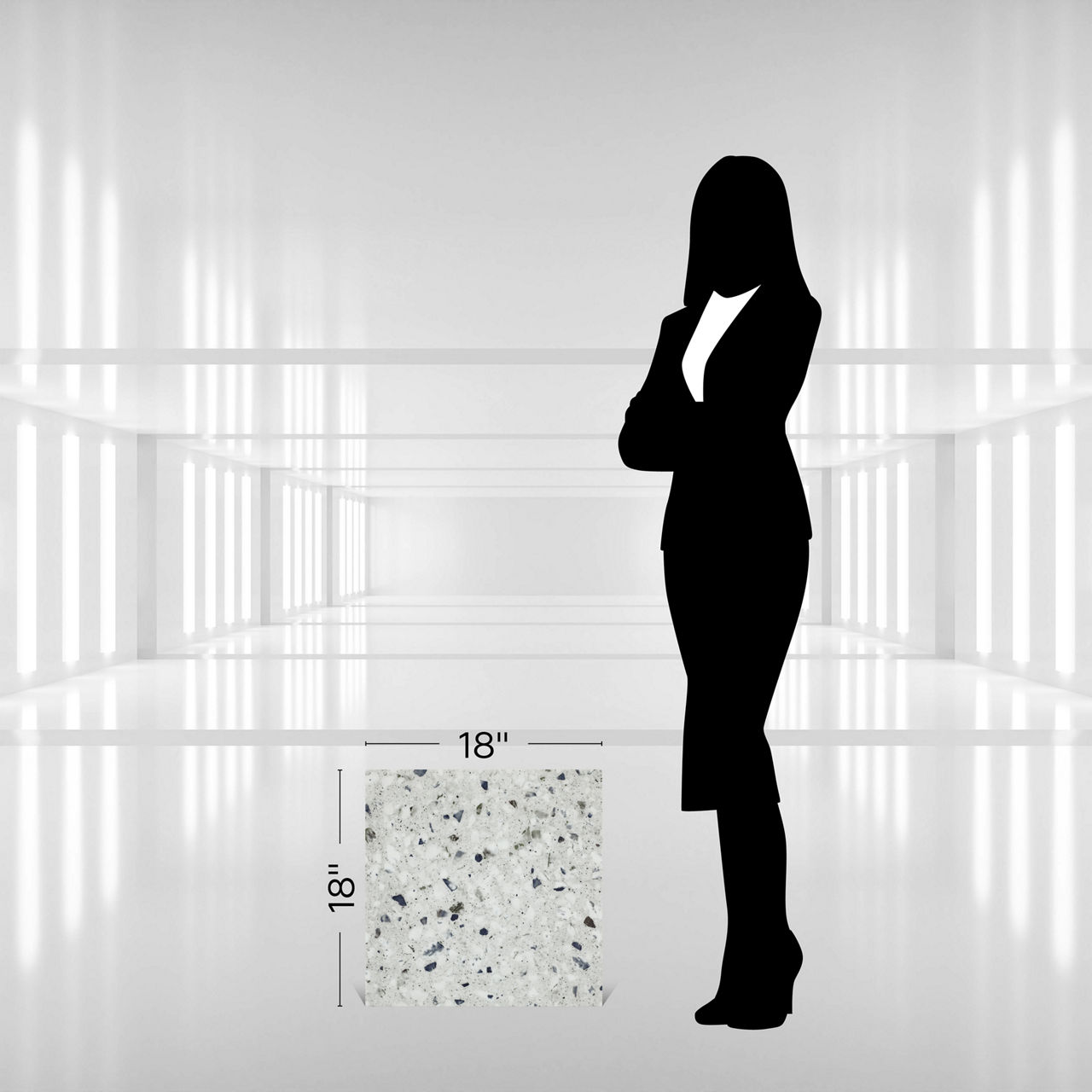 Multimedia Lake 18X18 TitanGuard luxury vinyl tile features a terrazzo look design with embossed texture. Designed in a 18X18 format, it offers durability and modern style. Its TitanGuard finish enhances performance, making it ideal for commercial floors. A perfect choice for contemporary interiors. The fleck distribution is uniquely balanced to create visual movement across the surface.