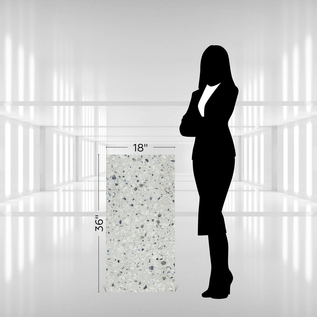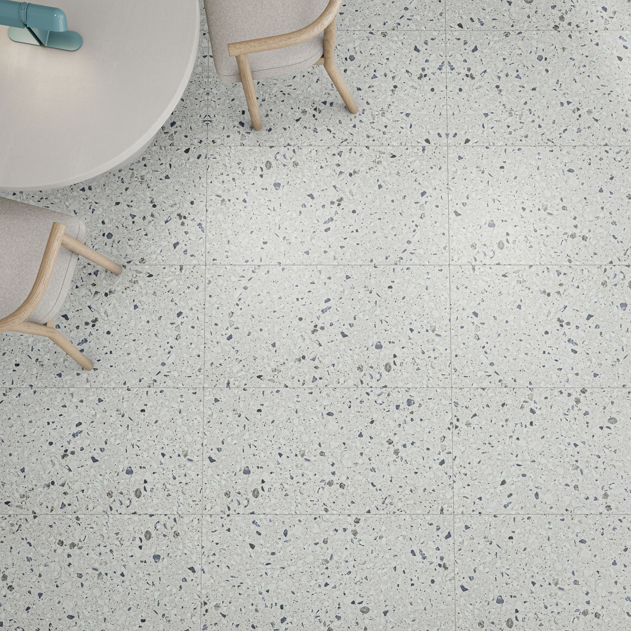 Multimedia Lake 18X36 TitanGuard luxury vinyl tile features a terrazzo look design with embossed texture. Designed in a 18X36 format, it offers durability and modern style. Its TitanGuard finish enhances performance, making it ideal for commercial floors. A perfect choice for contemporary interiors. The fleck distribution is uniquely balanced to create visual movement across the surface.