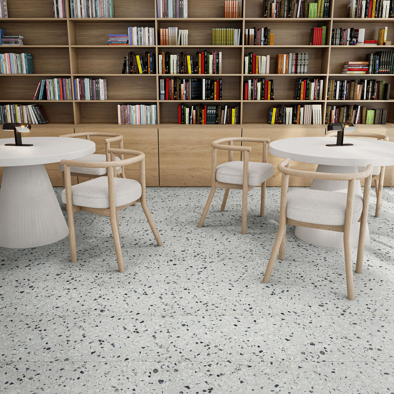 This terrazzo-look luxury vinyl tile showcases organic flecking with bold visual texture and durable waterproof performance. Each SKU features unique visual variation for added design authenticity.