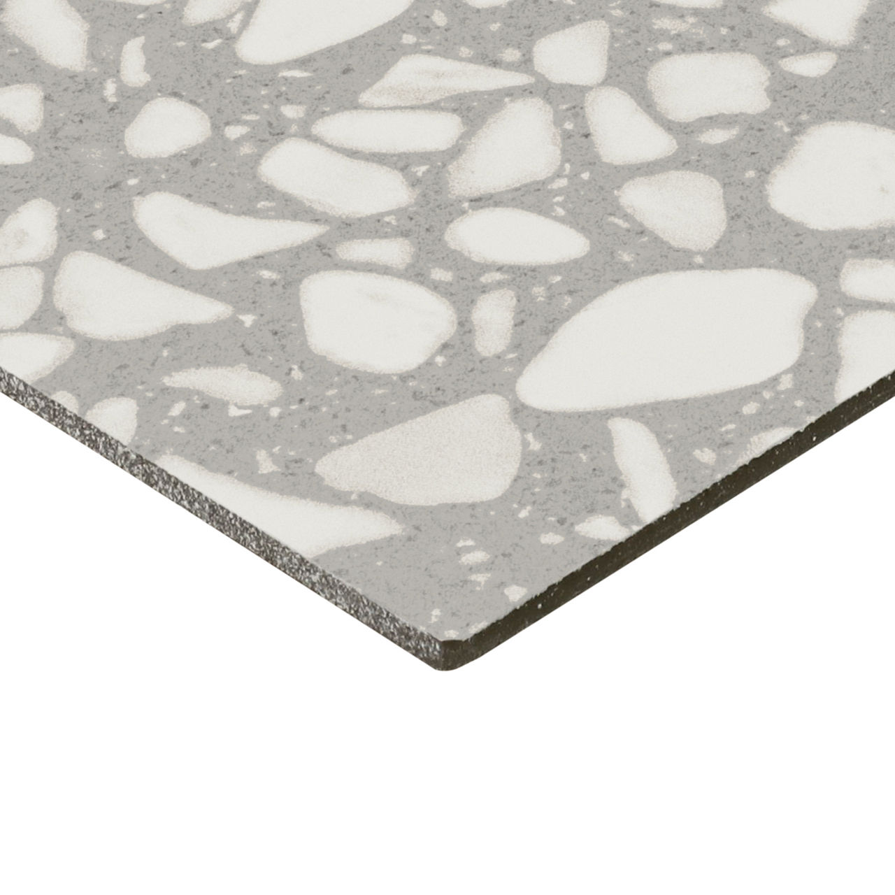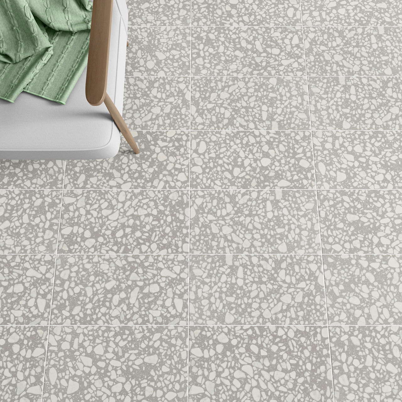 This dark terrazzo-look tile features a Grande pattern with durable performance for versatile spaces.