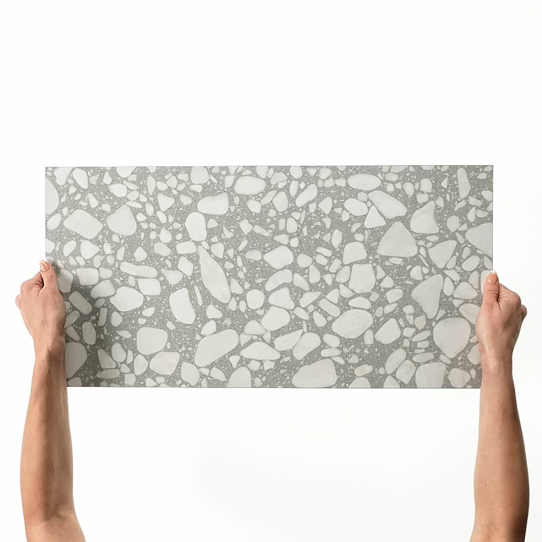 Dark terrazzo-look porcelain tile in Dusk. A 12X24 matte tile with Grande pattern for modern design.