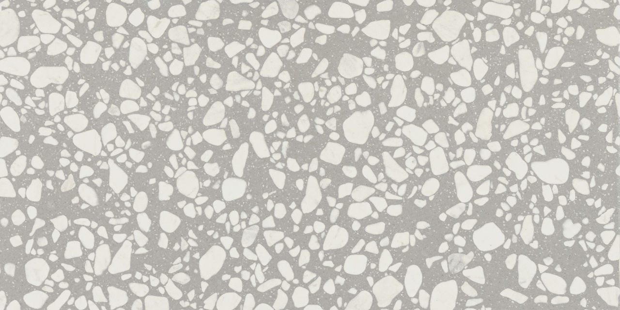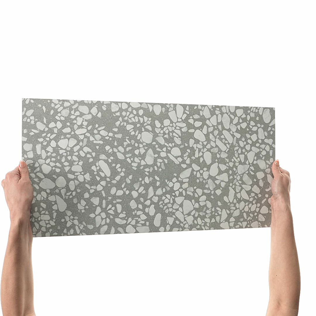 Dark terrazzo-look porcelain tile in Dusk. A 12X24 matte tile with Medio pattern for modern design.