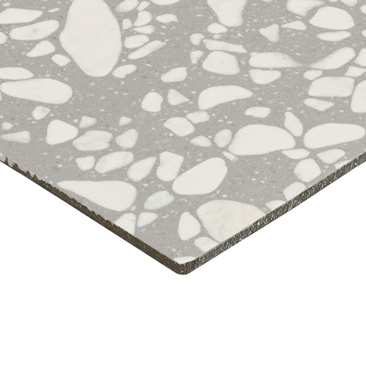 This dark terrazzo-look tile features a Medio pattern with durable performance for versatile spaces.