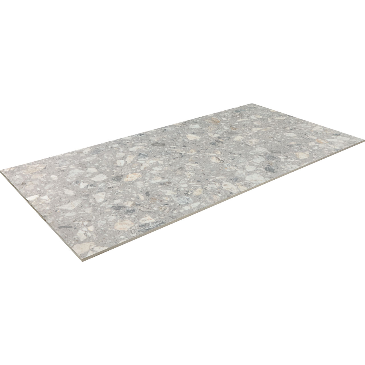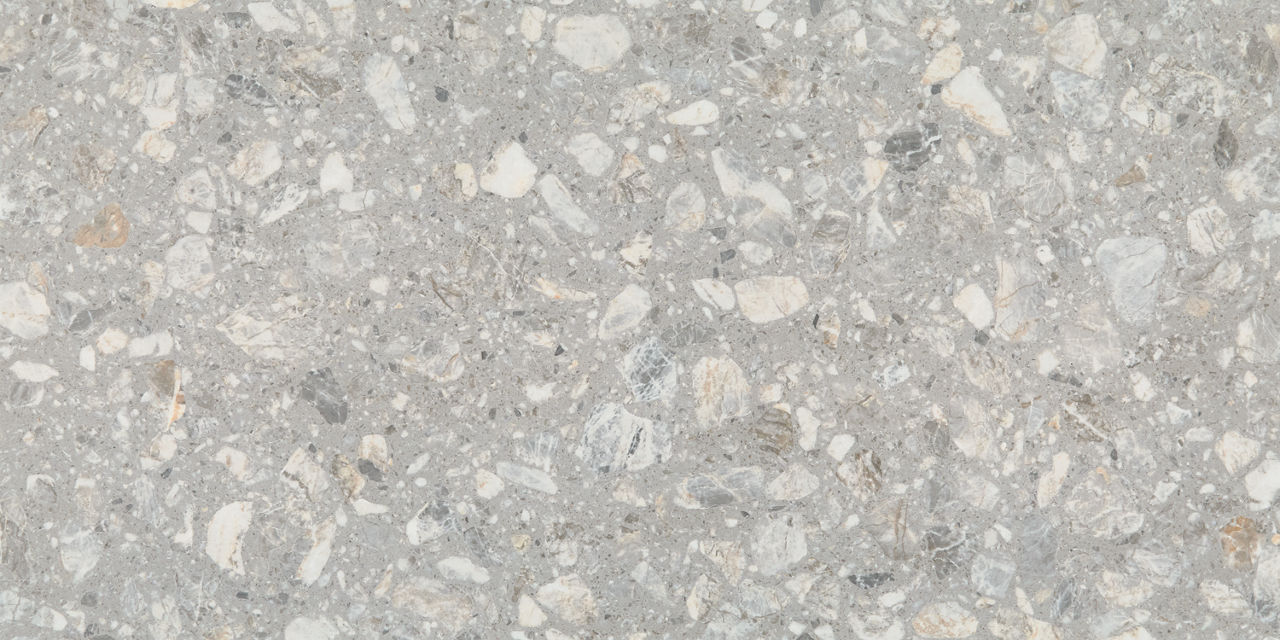 Dark terrazzo-look porcelain tile in Dusk. A 24X48 matte tile with Alto pattern for modern design.