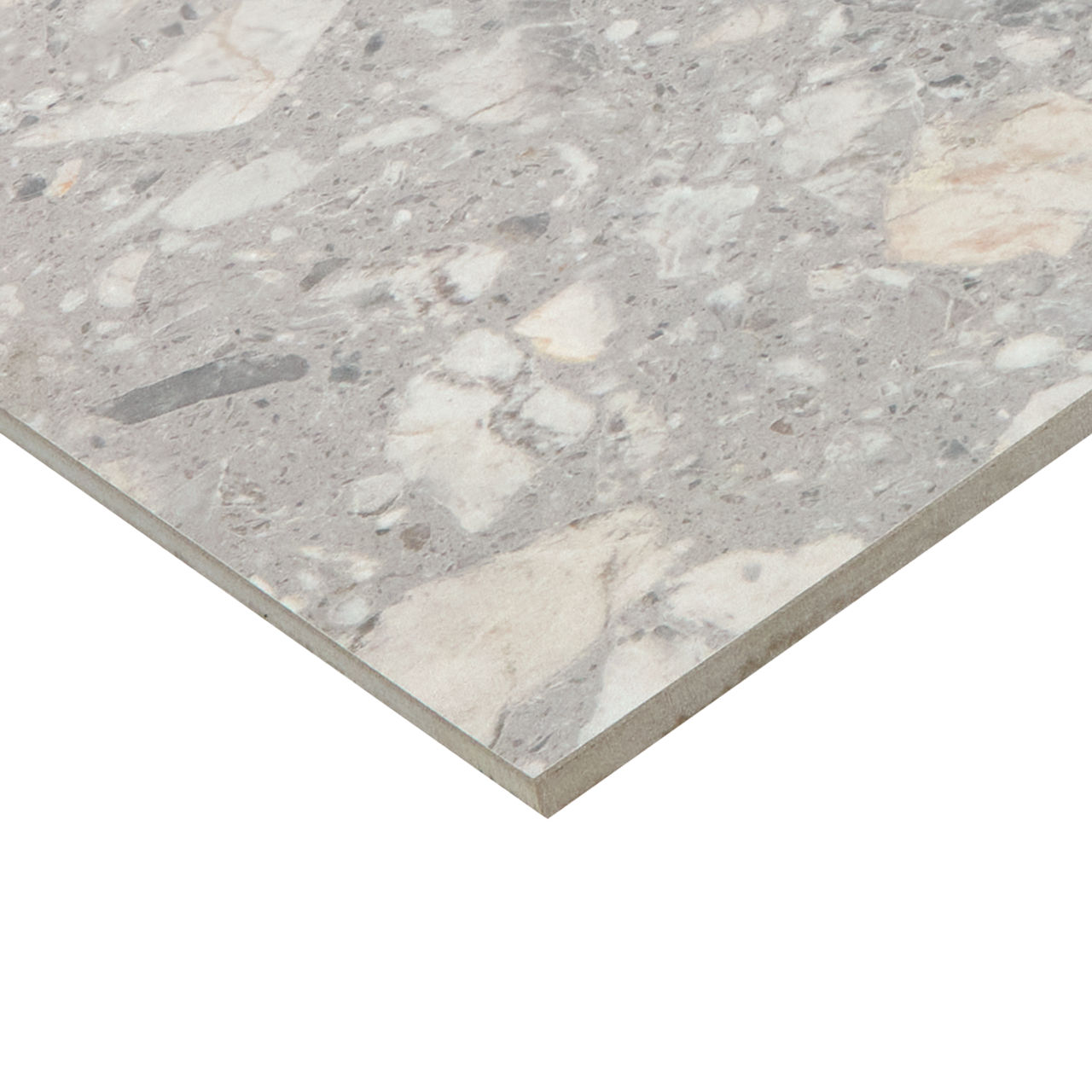 Outlander Dusk 24X48 Alto terrazzo-look porcelain tile features a bold, high-contrast aggregate pattern in durable ColorBody construction. Designed in a 24X48 format, it delivers a large-format design that minimizes grout lines with a dark tonal palette. Its StepWise slip-resistant matte finish enhances performance, making it ideal for indoor and outdoor applications.