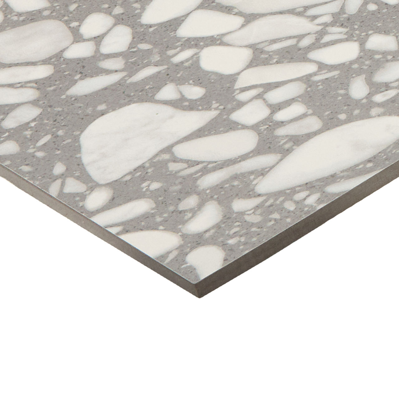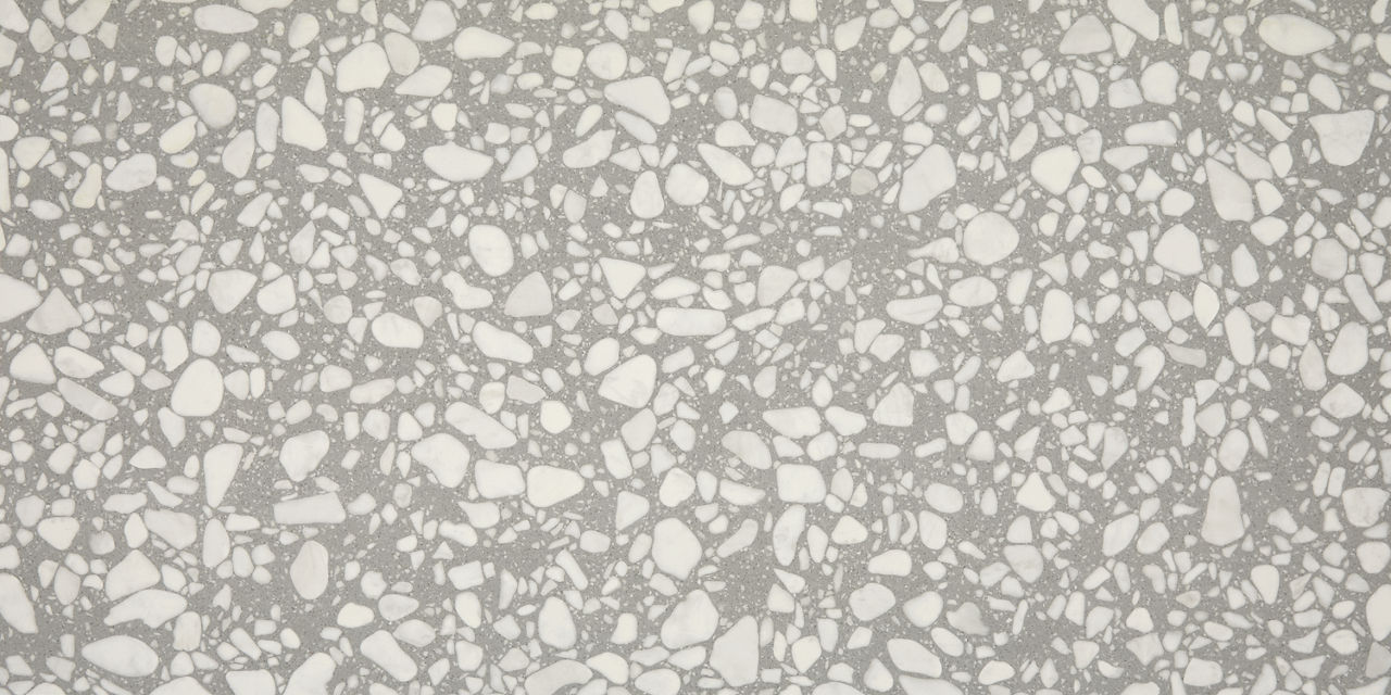 This dark terrazzo-look tile features a Grande pattern with durable performance for versatile spaces.