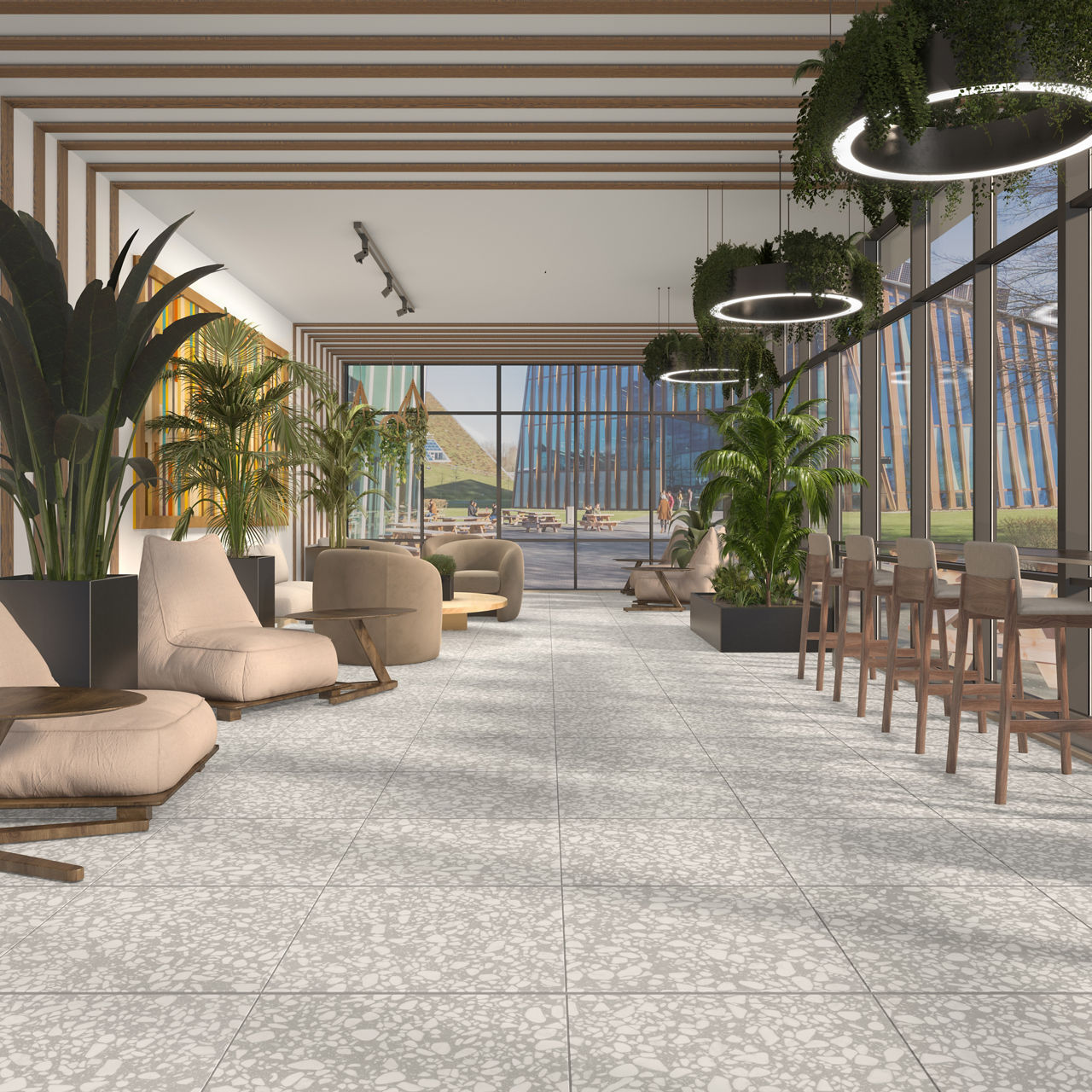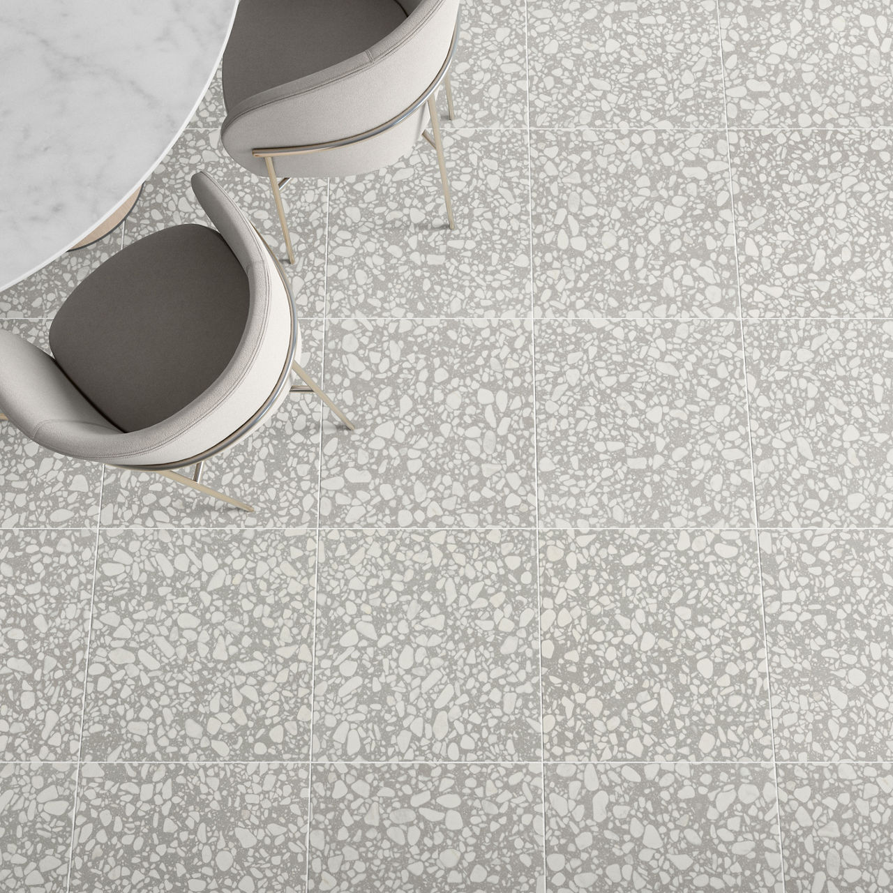 For a full list of coordinating trim options, visit https://www.daltile.com/products/terrazzo-look/outlander/dusk-square-24x24-grande-stepwise-matte