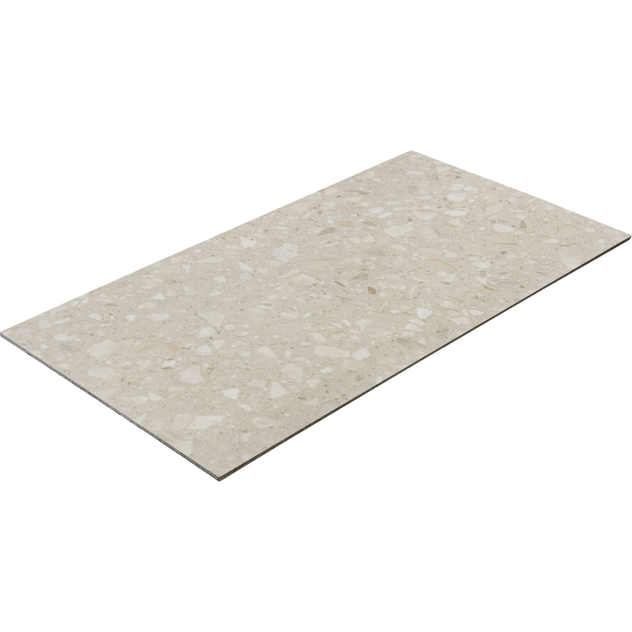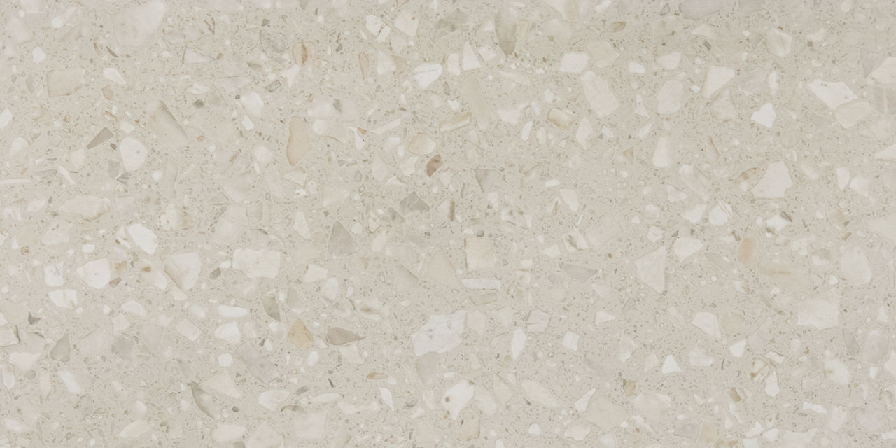 Mid-tone terrazzo-look porcelain tile in Echo. A 12X24 matte tile with Medio pattern for modern design.