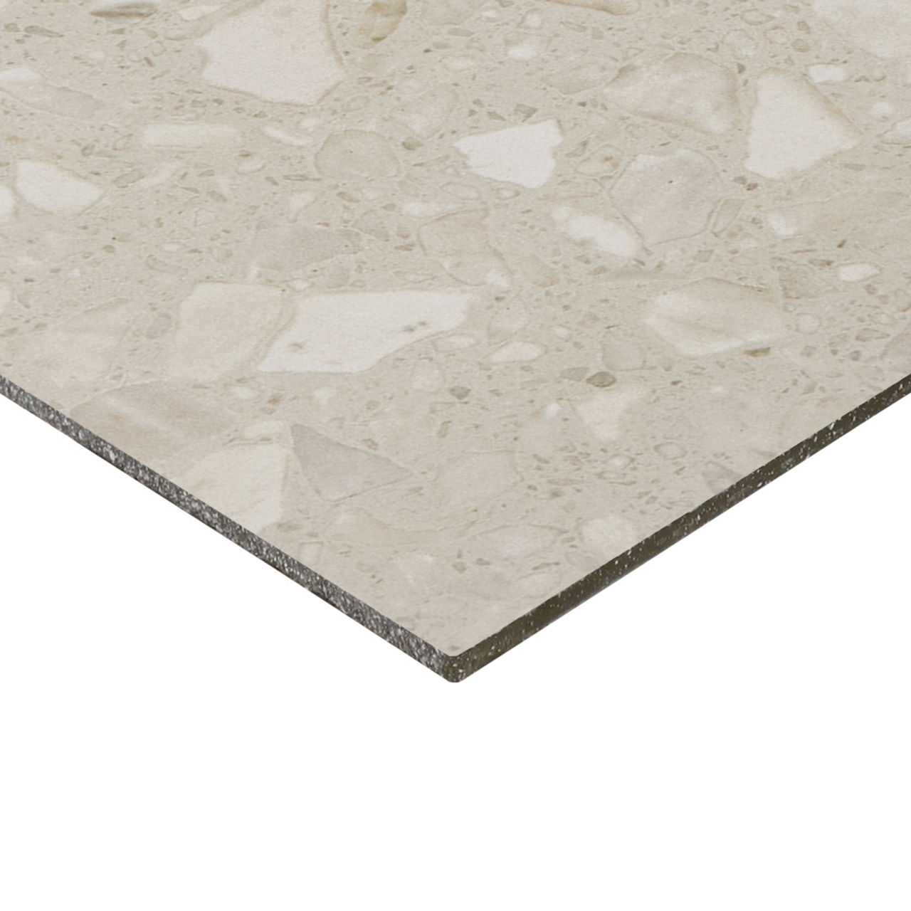 This mid-tone terrazzo-look tile features a Medio pattern with durable performance for versatile spaces.