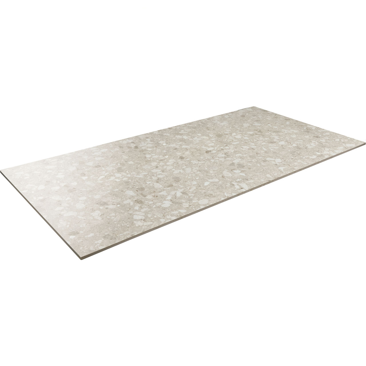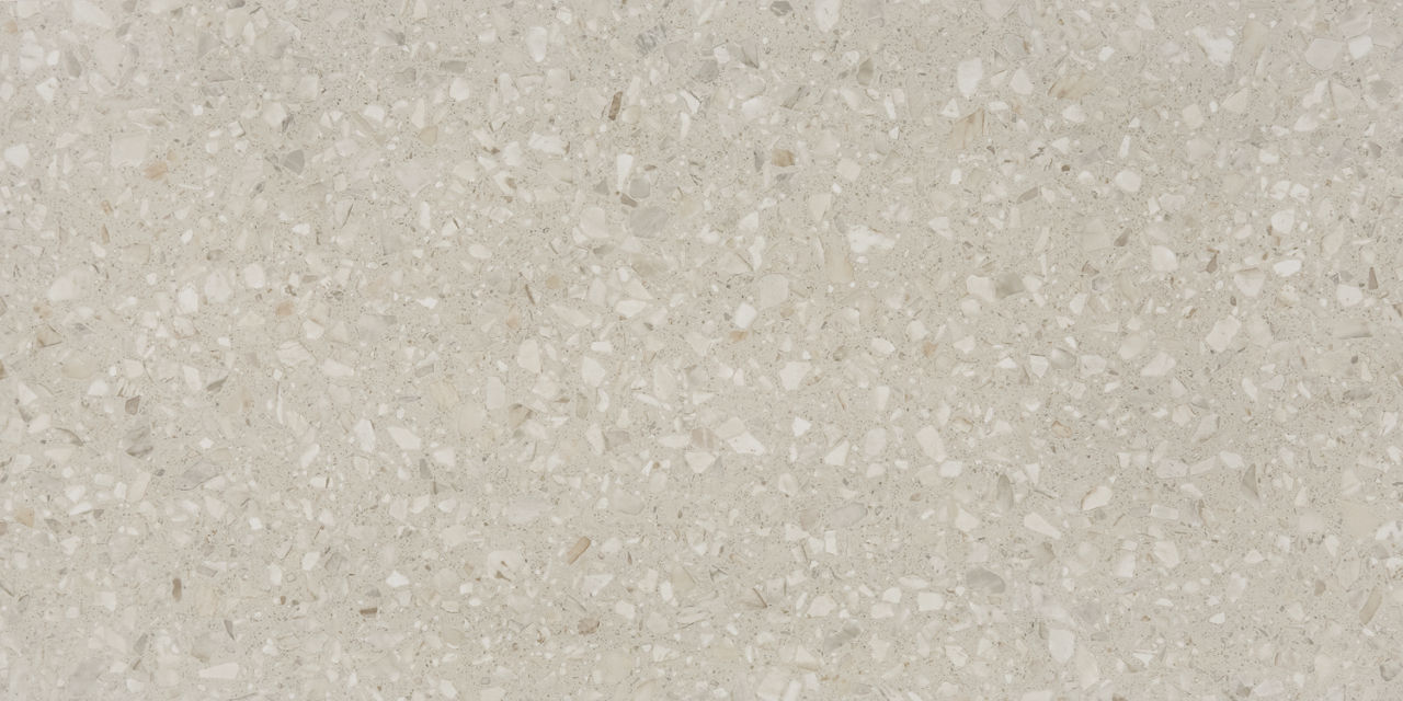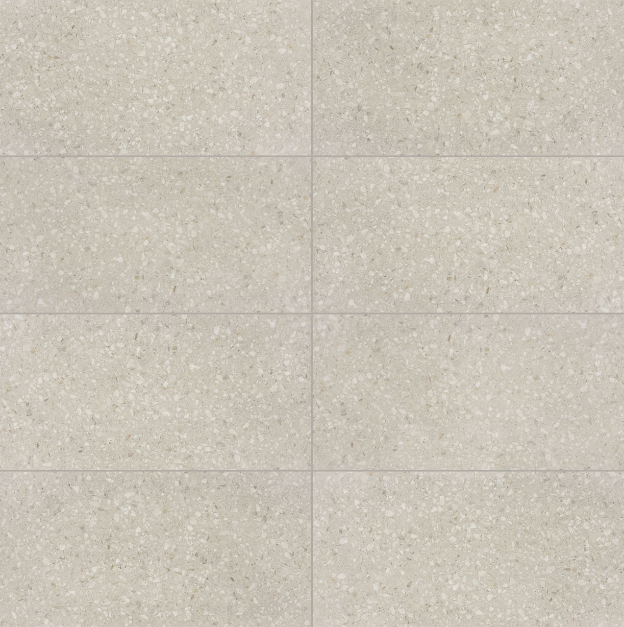 Mid-tone terrazzo-look porcelain tile in Echo. A 24X48 satin polished tile with Grande pattern for modern design.