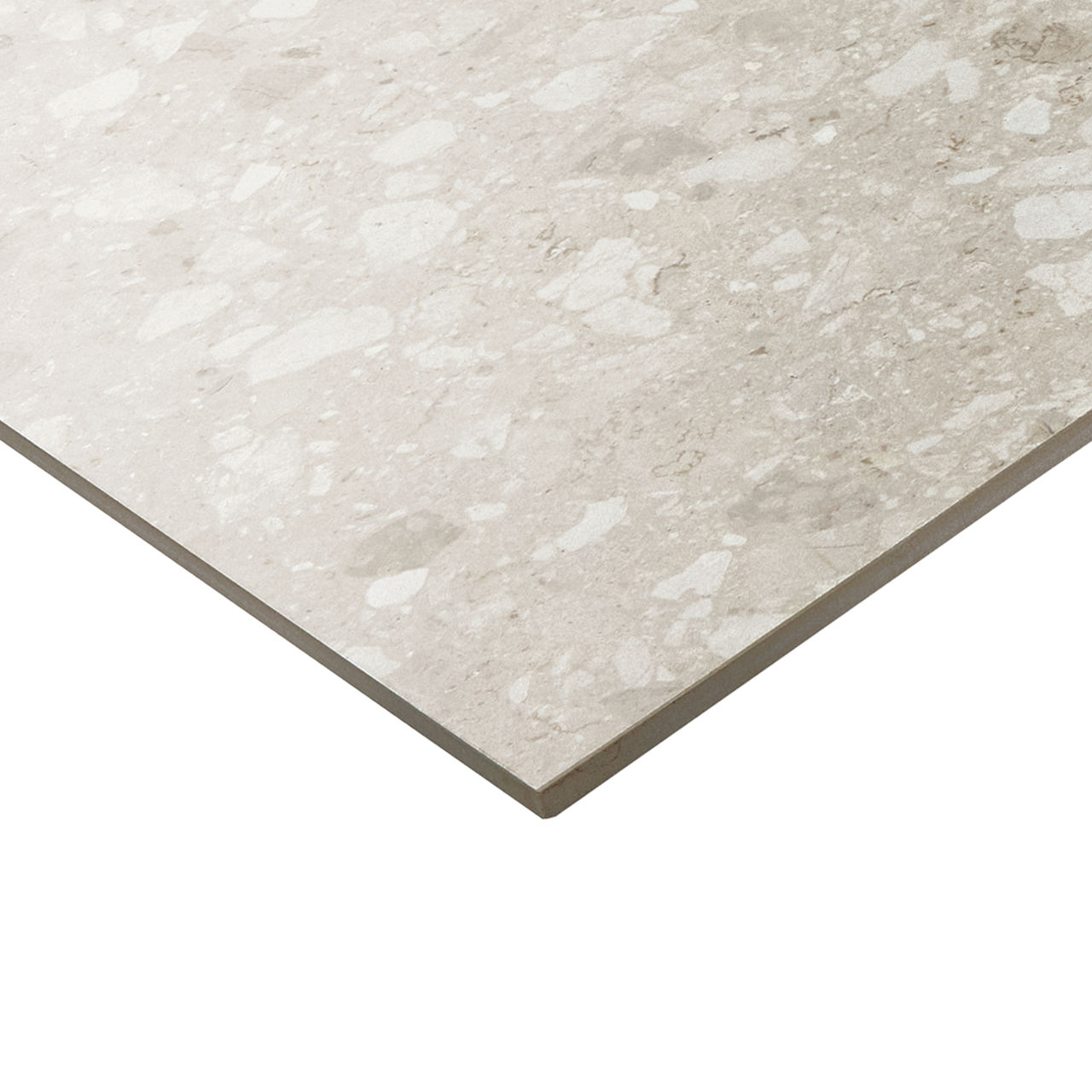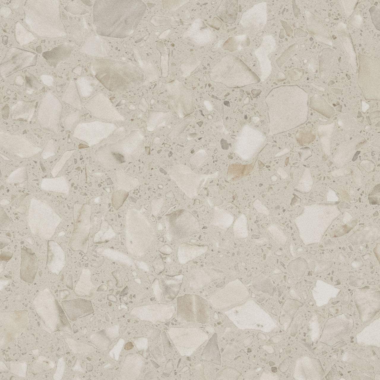 This mid-tone terrazzo-look tile features a Grande pattern with durable performance for versatile spaces.