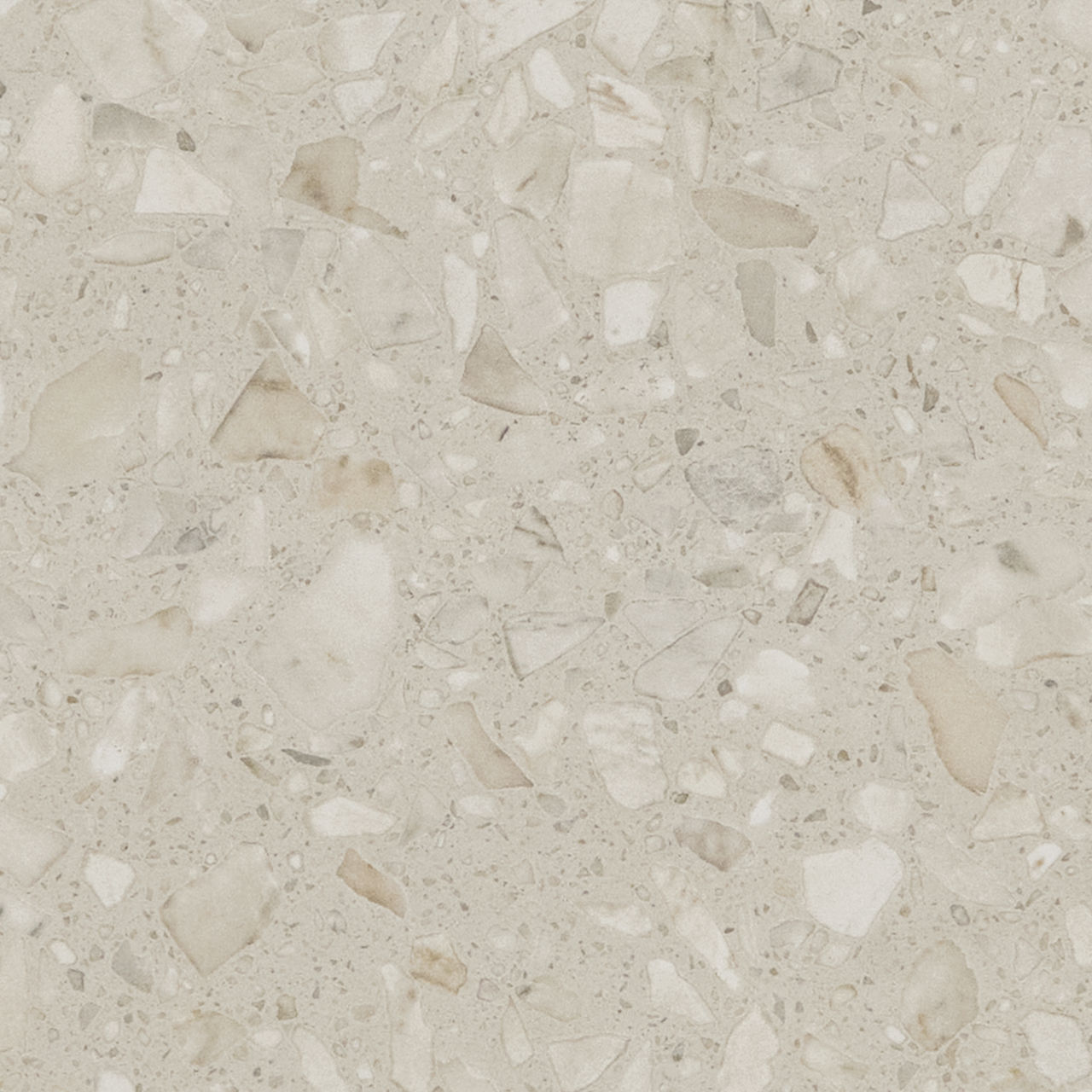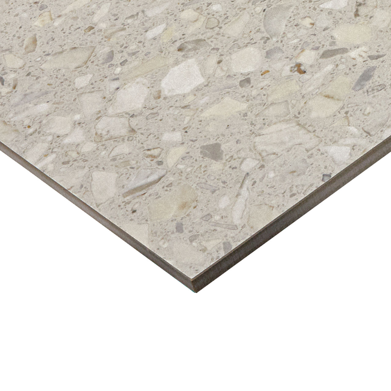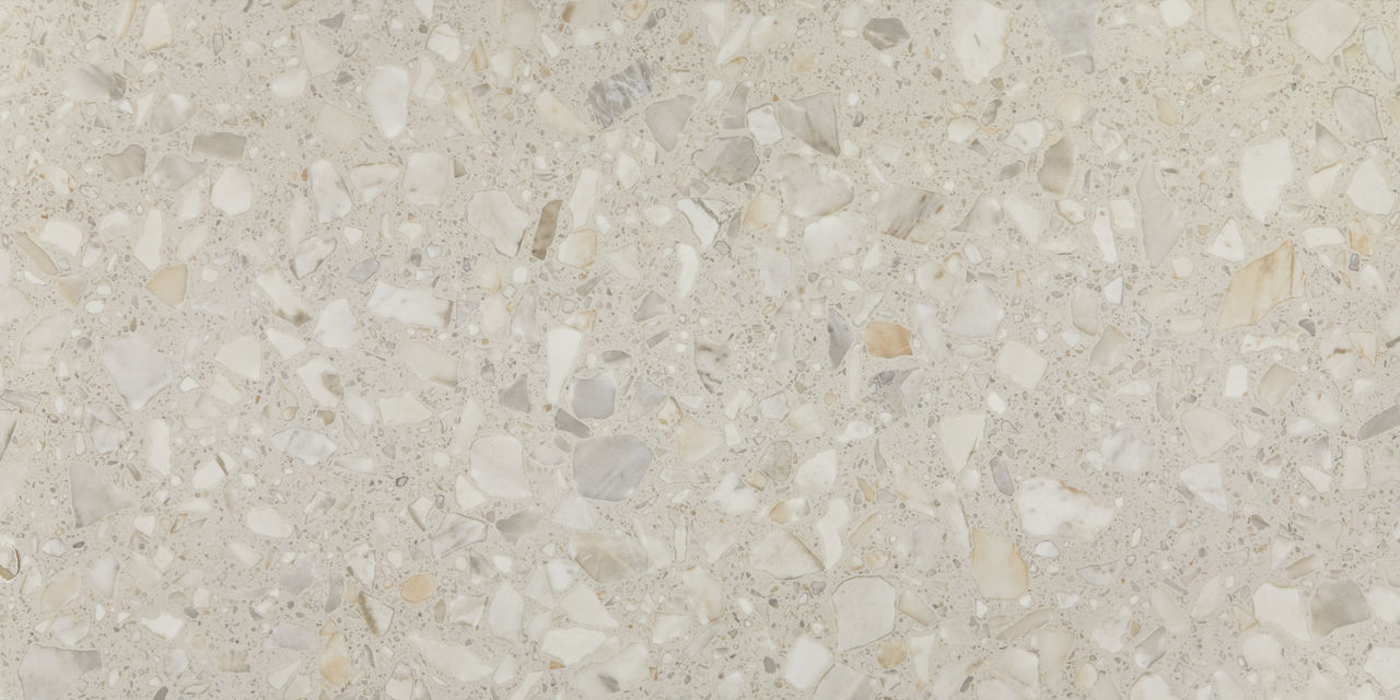 This mid-tone terrazzo-look tile features a Medio pattern with durable performance for versatile spaces.