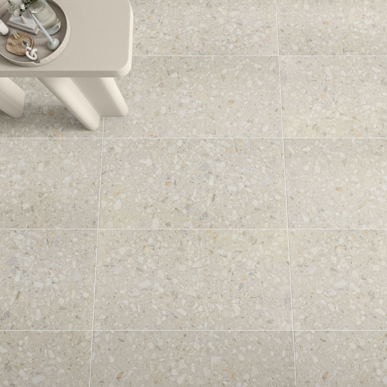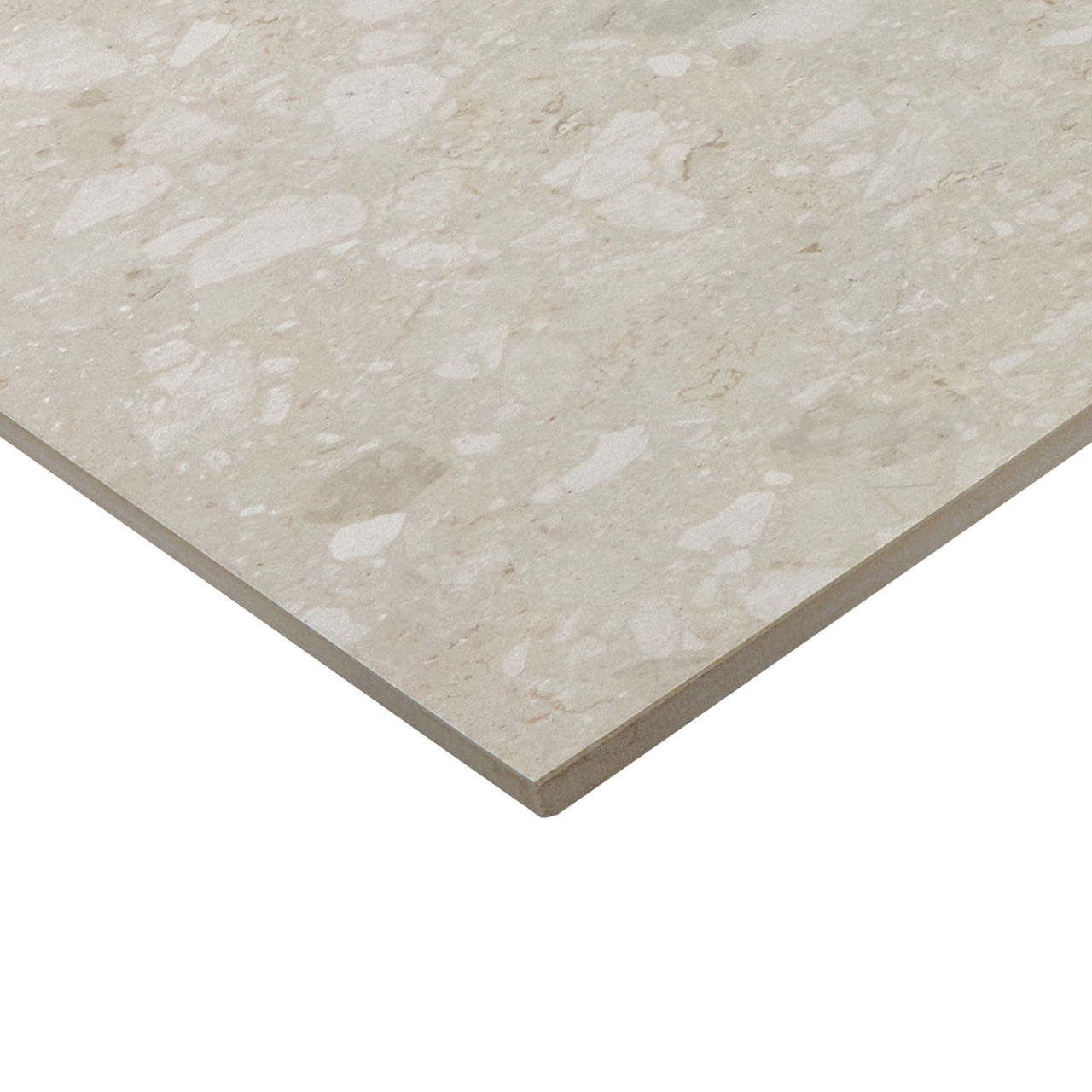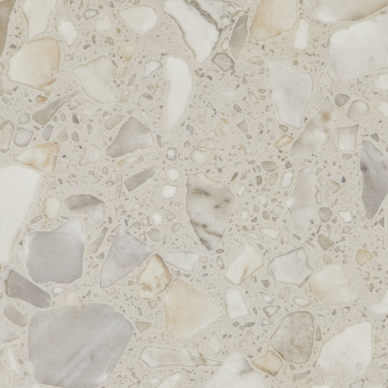 This mid-tone terrazzo-look tile features a Medio pattern with durable performance for versatile spaces.