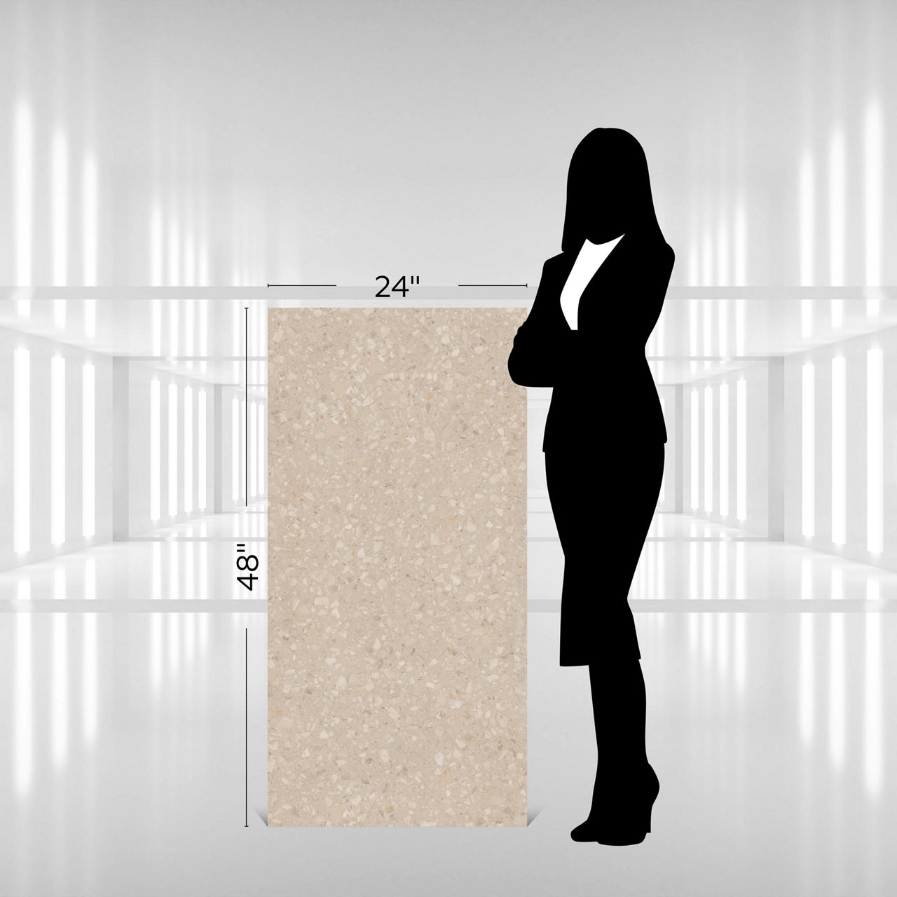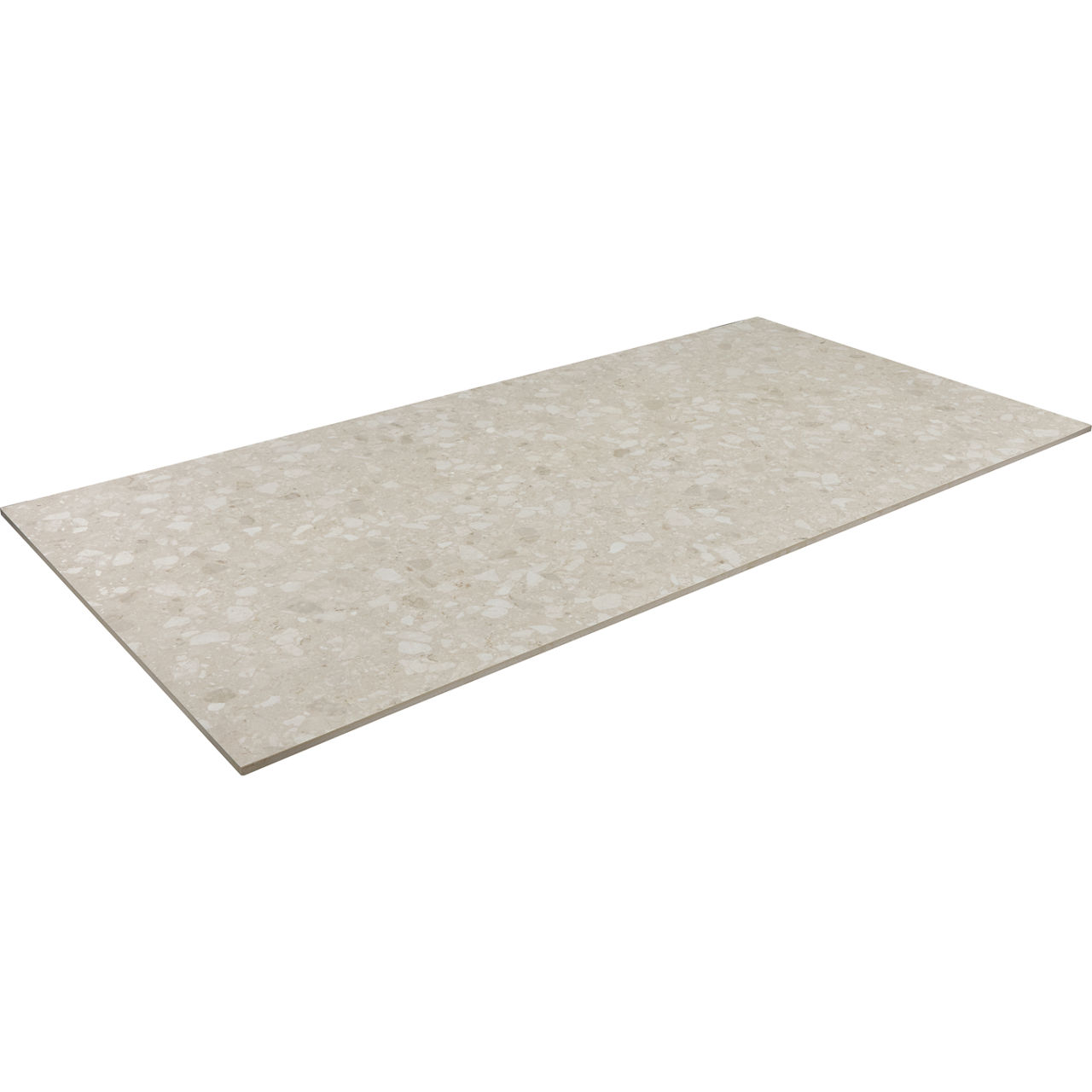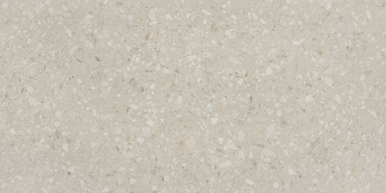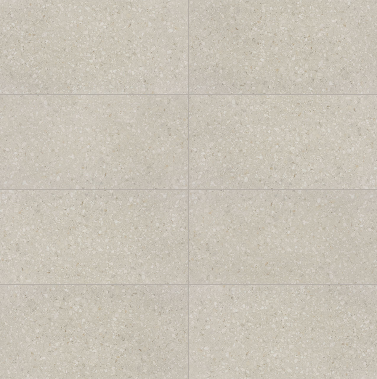 Mid-tone terrazzo-look porcelain tile in Echo. A 24X48 matte tile with Medio pattern for modern design.