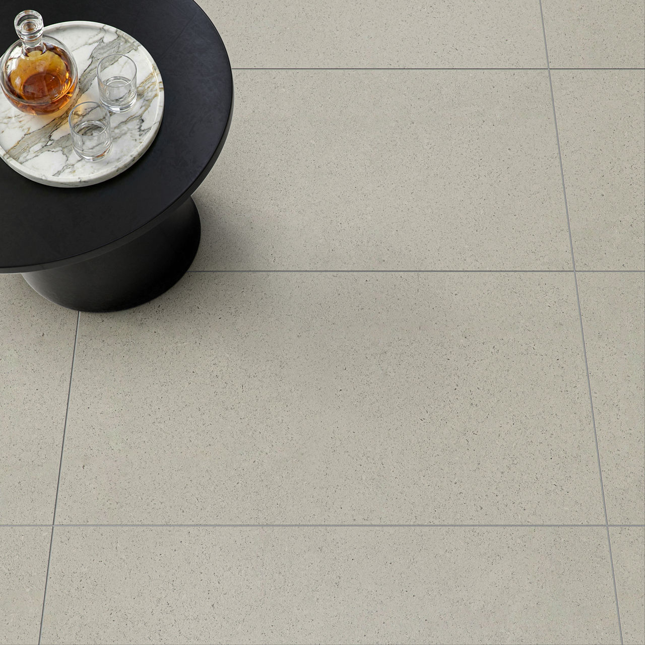 Mid-tone terrazzo-look porcelain tile in Echo. A 24X48 matte tile with Palazzo pattern for modern design.