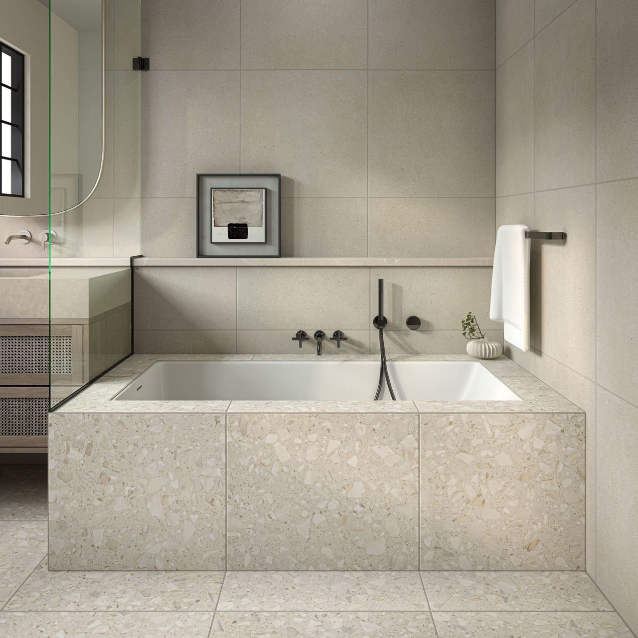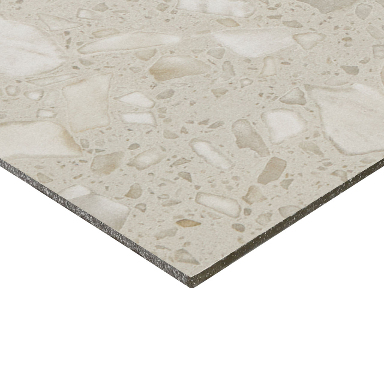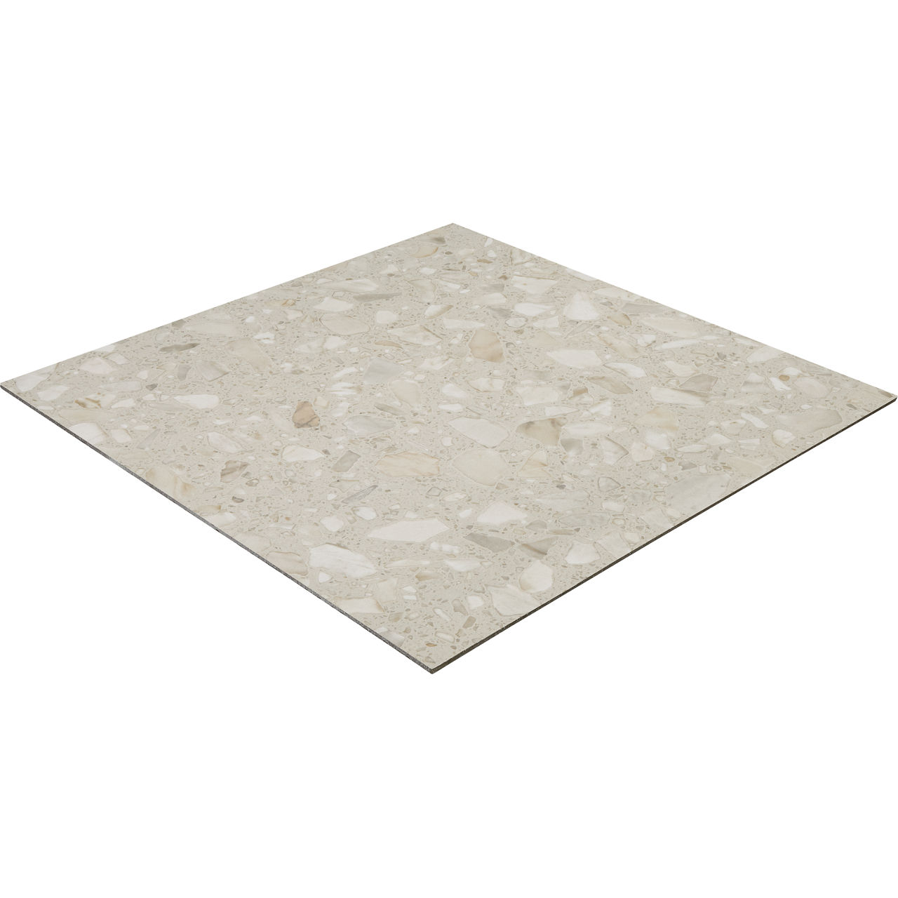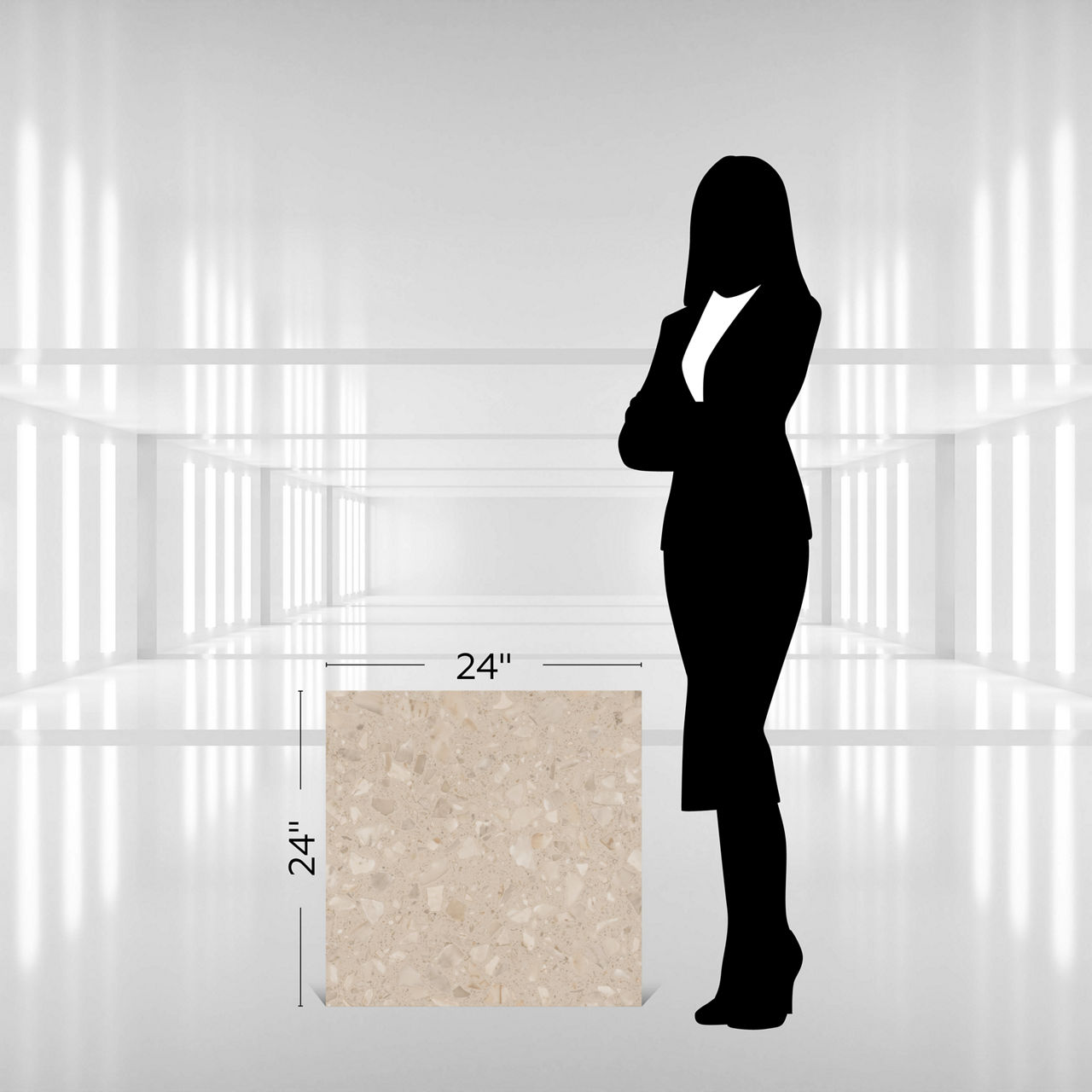 Mid-tone terrazzo-look porcelain tile in Echo. A 24X24 matte tile with Grande pattern for modern design.