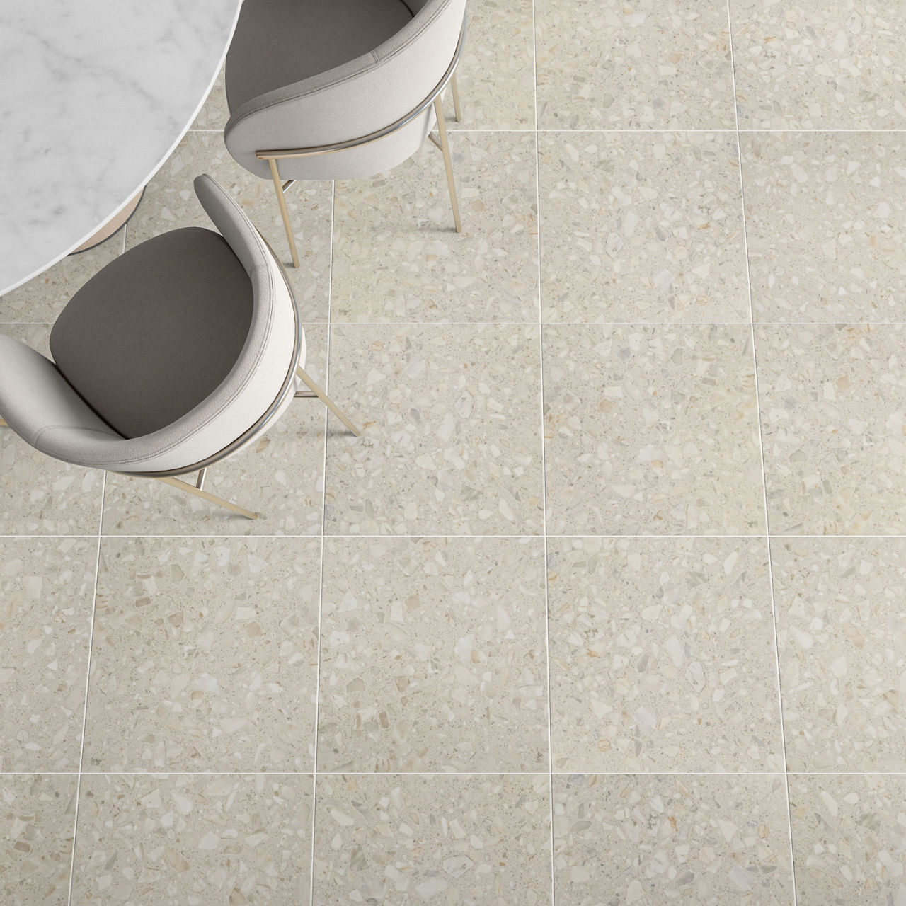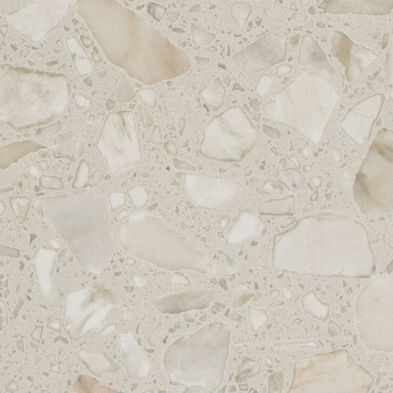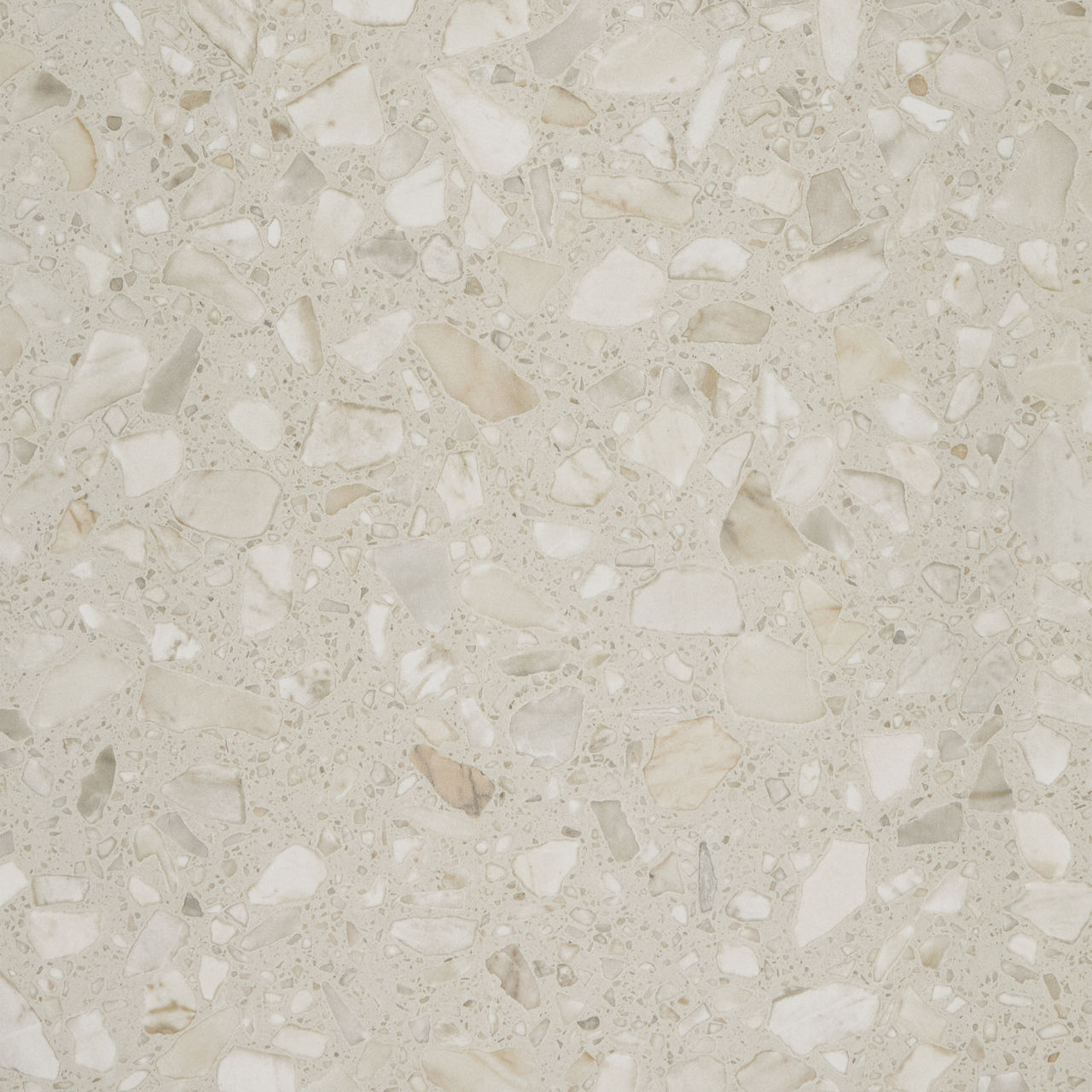 This mid-tone terrazzo-look tile features a Grande pattern with durable performance for versatile spaces.