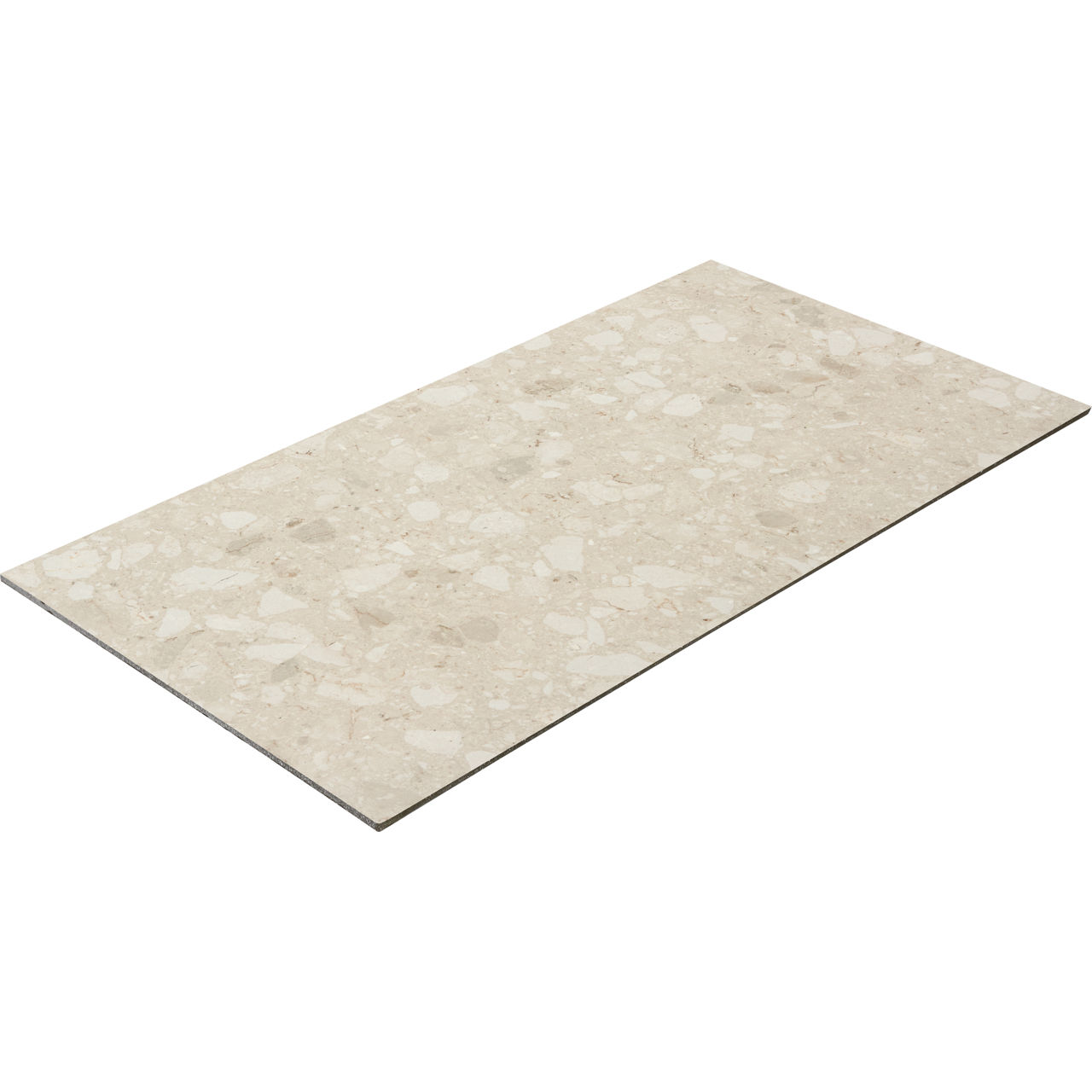 Light terrazzo-look porcelain tile in Lumen. A 12X24 matte tile with Medio pattern for modern design.