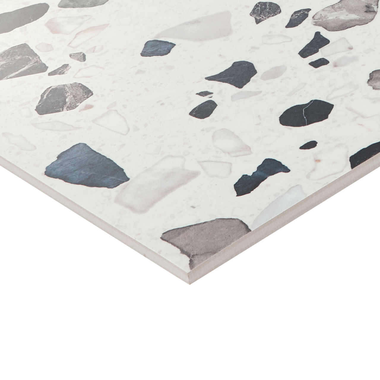 This dark terrazzo-look tile features a Grande pattern with durable performance for versatile spaces.