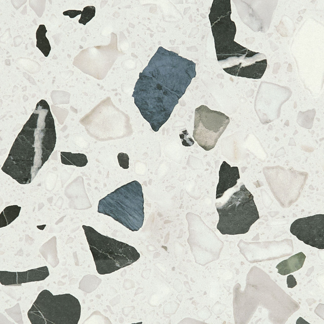 Dark terrazzo-look porcelain tile in Marine. A 24X48 satin polished tile with Grande pattern for modern design.