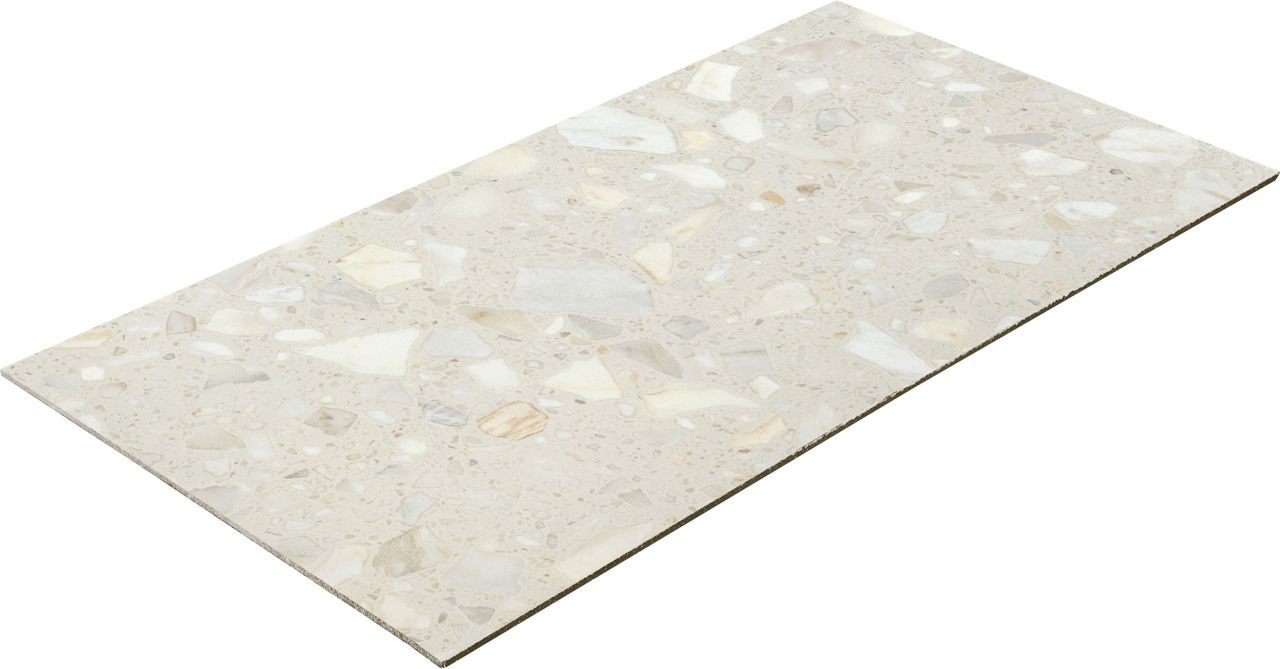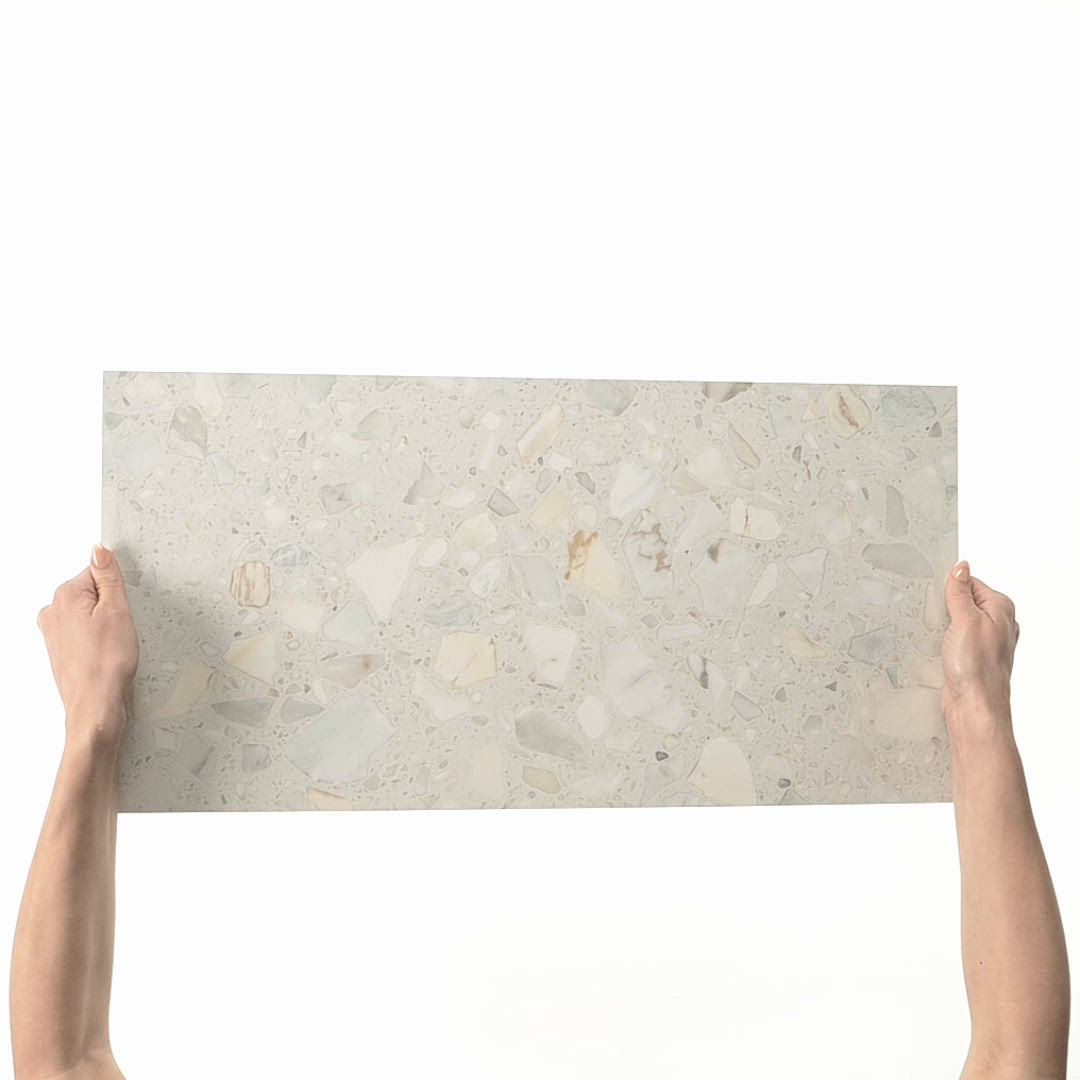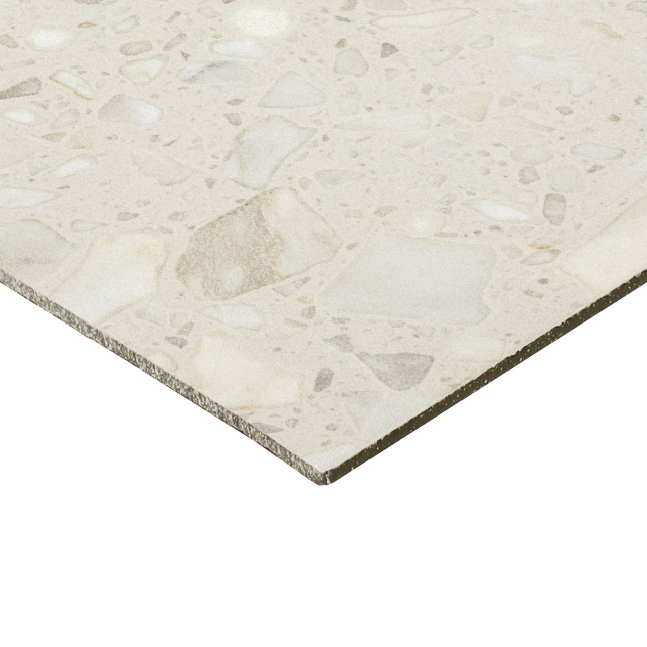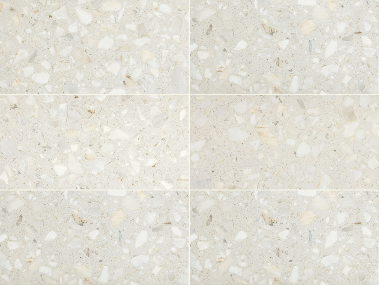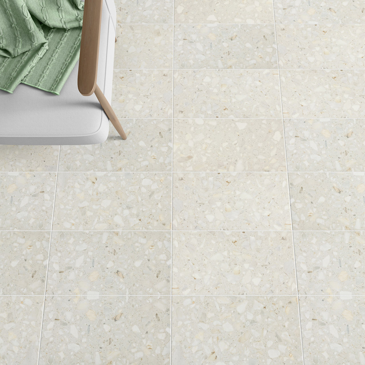 This light terrazzo-look tile features a Grande pattern with durable performance for versatile spaces.
