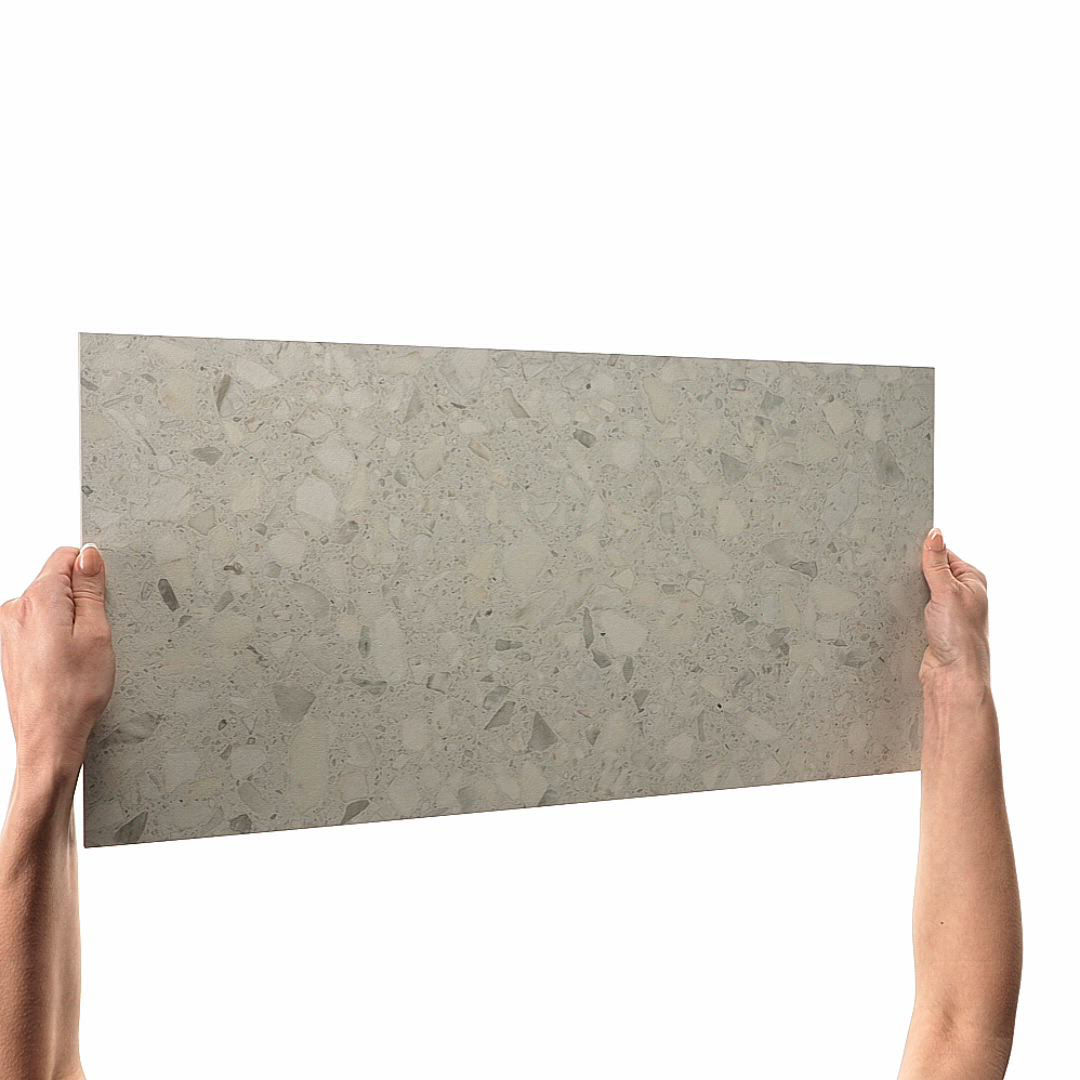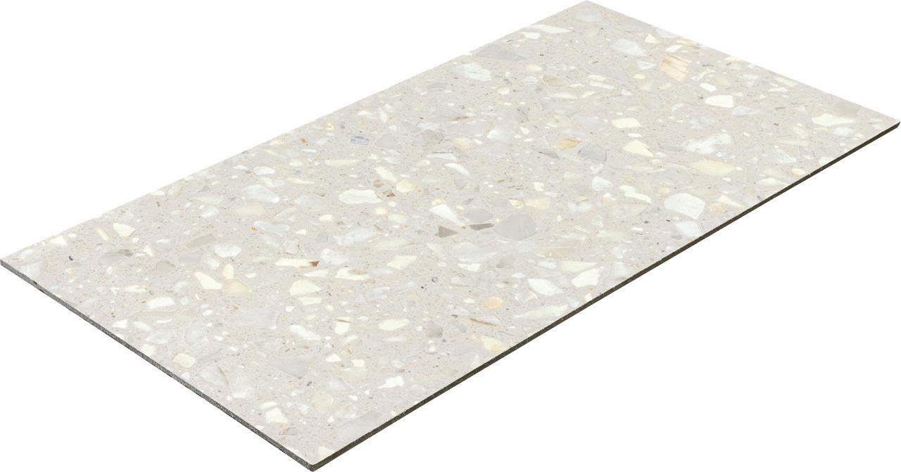 Light terrazzo-look porcelain tile in Moonlight. A 12X24 matte tile with Medio pattern for modern design.