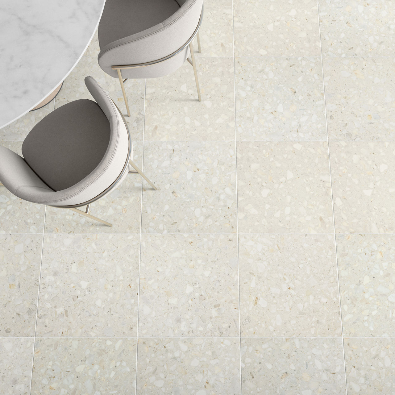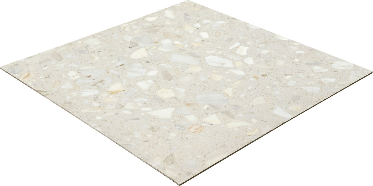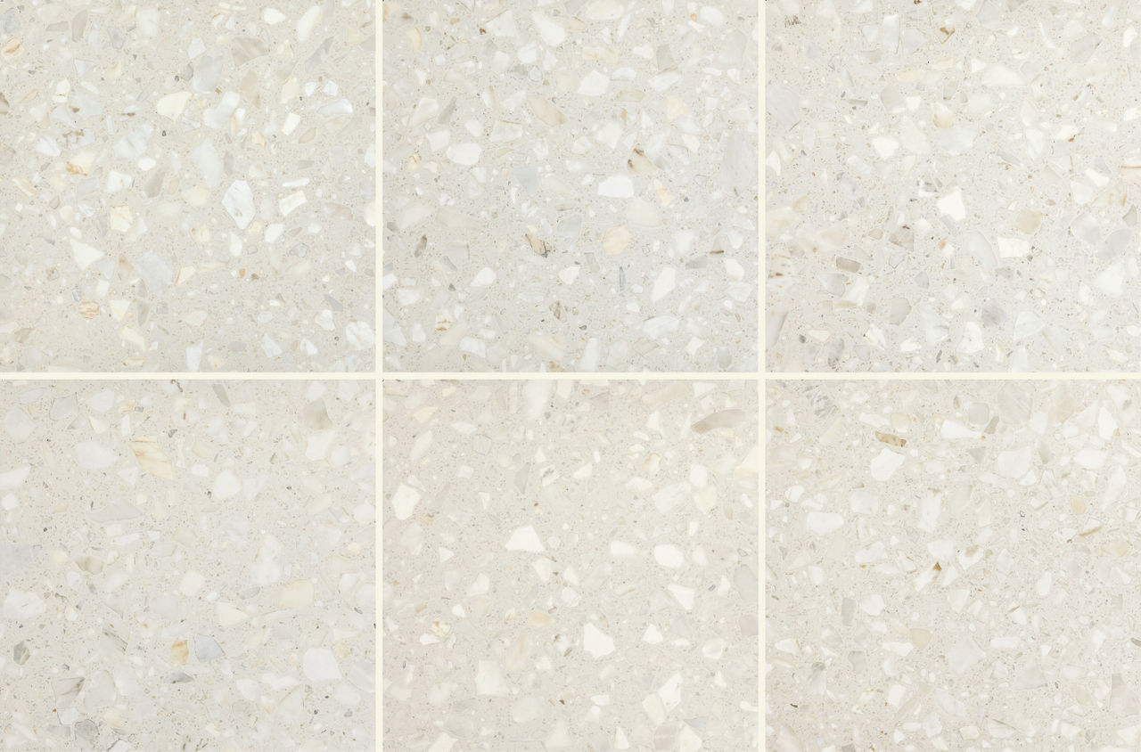 This light terrazzo-look tile features a Grande pattern with durable performance for versatile spaces.