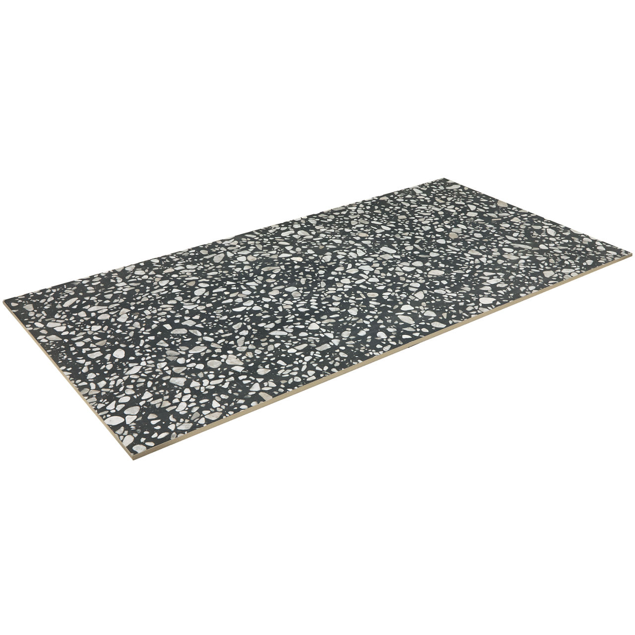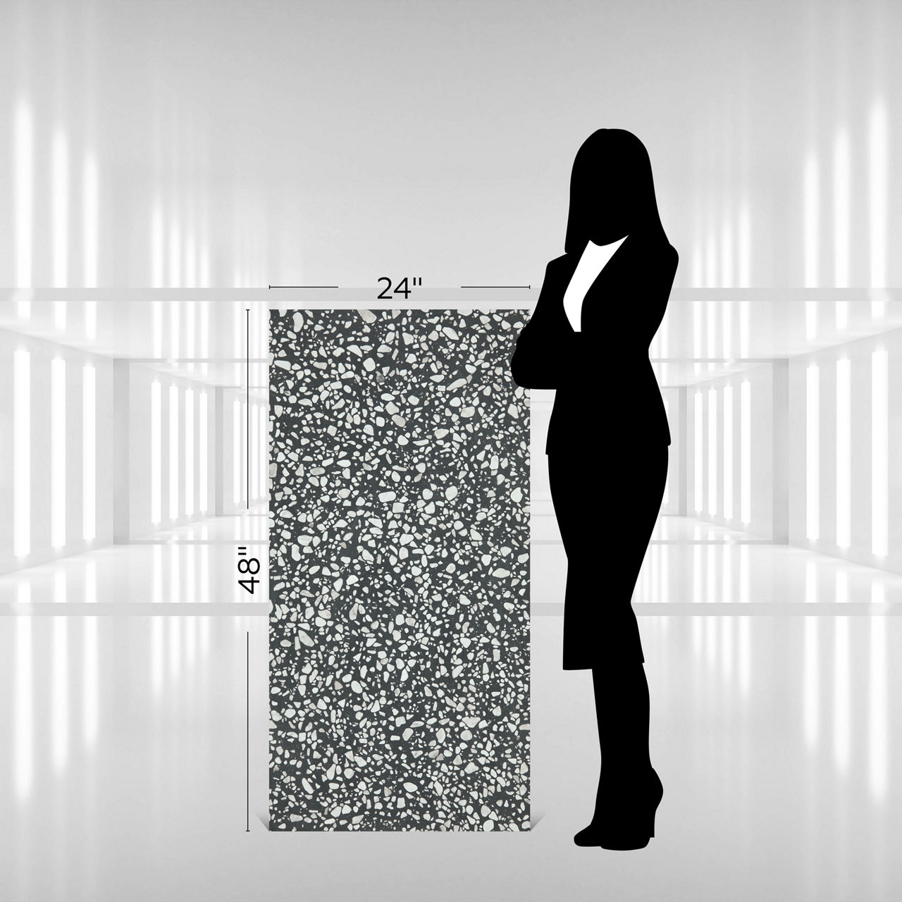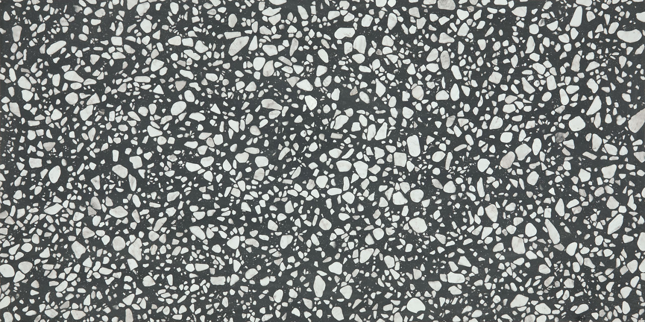 Dark terrazzo-look porcelain tile in Onyx. A 24X48 matte tile with Medio pattern for modern design.